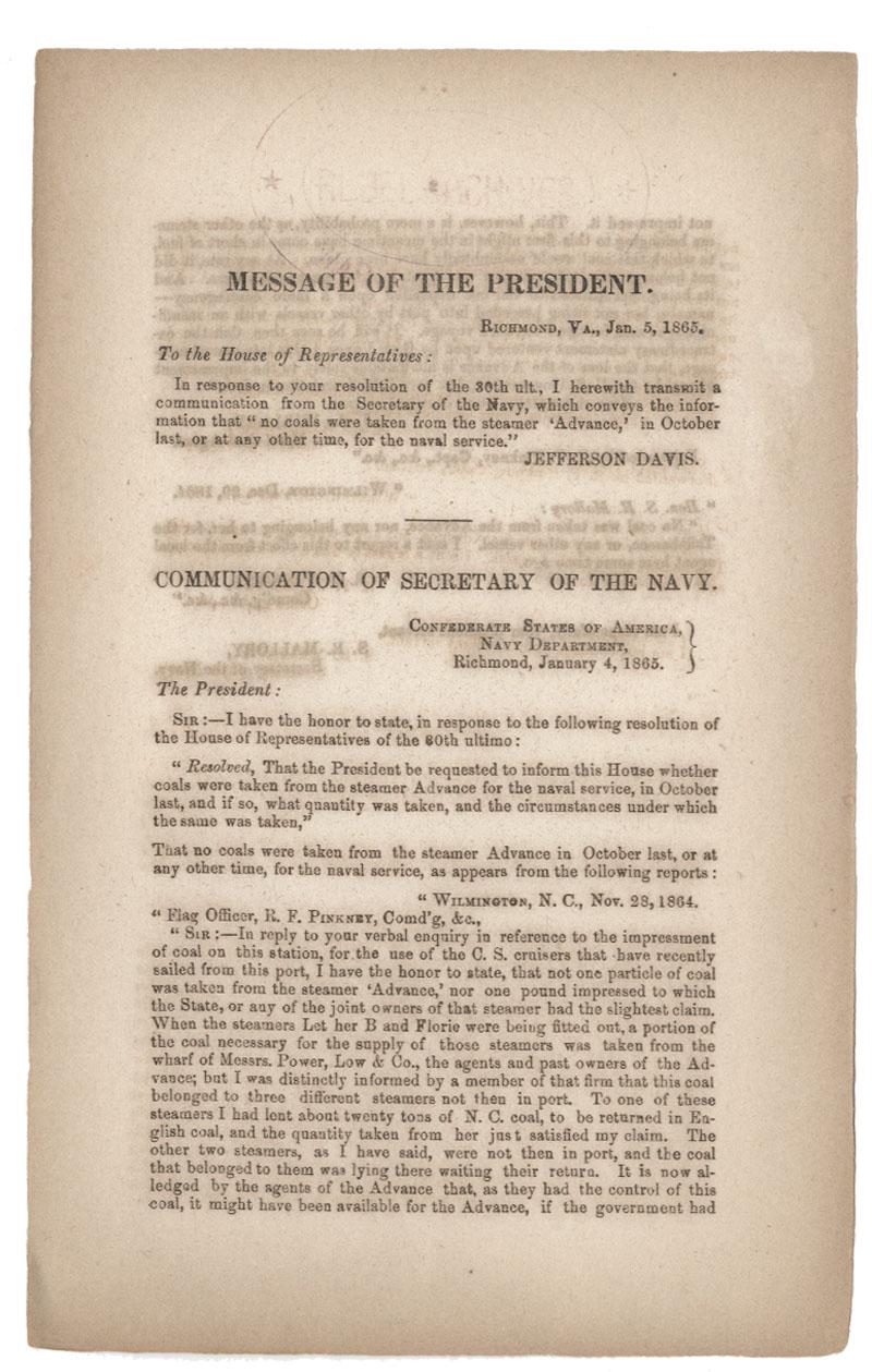 [Confederate Imprint] 6 1/4" x 9 3/4". 2pp., Richmond, Va., Jan. 5, 1865, transmitting communication from the Secretary of the Navy that “ no coals were taken from the Steamer Advance.” Fine Condition.