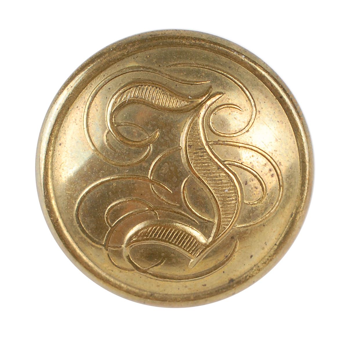 Coat-size brass button as worn on the uniform coat of Confederate soldiers, measuring approximately 1? in diameter, with a gilt face featuring a stippled letter “I” in an ornate script displayed on an unlined field. Exhibits a backmark of “Halfmann & Taylor, Montgomery, Alabamd [sic].” In fine condition. Provenance: The Horse Soldier.