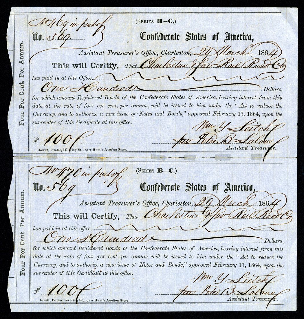 South Carolina, 1864, Uncut pair, 4% Interim Certificates, Issued for the Charleston & Savannah Rail Road Co., Black on light blue paper, S/N 469 and 470 in part of 569. Reinforced at fold between the 2 notes, Choice Fine to VF. Jewitt, Printer.