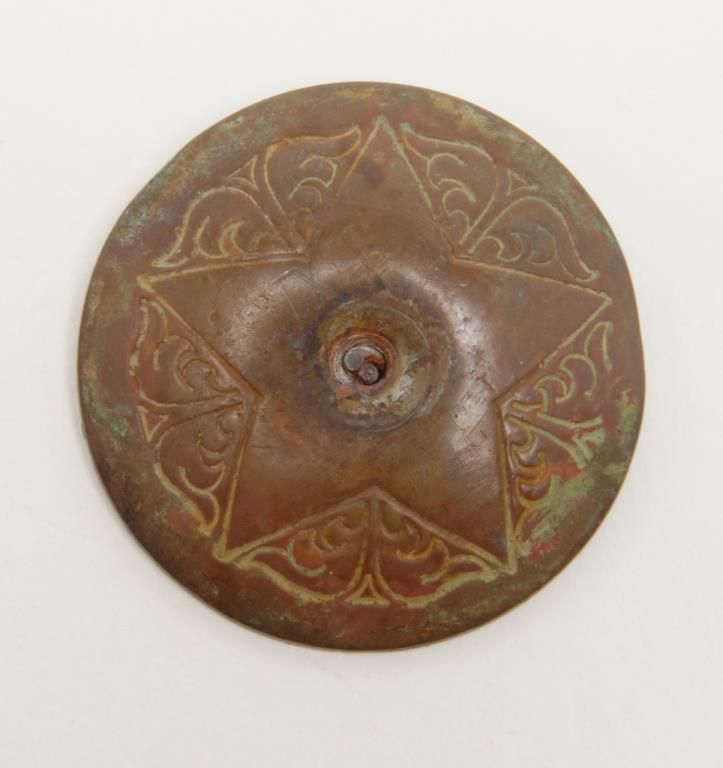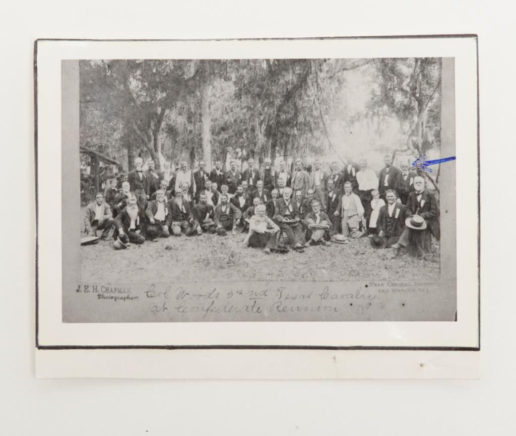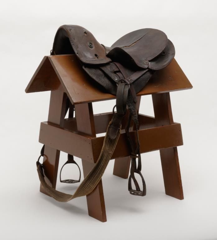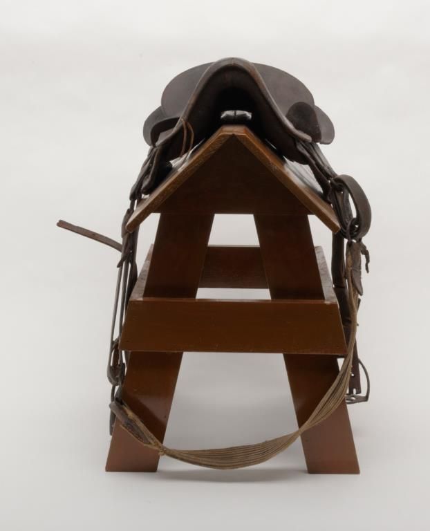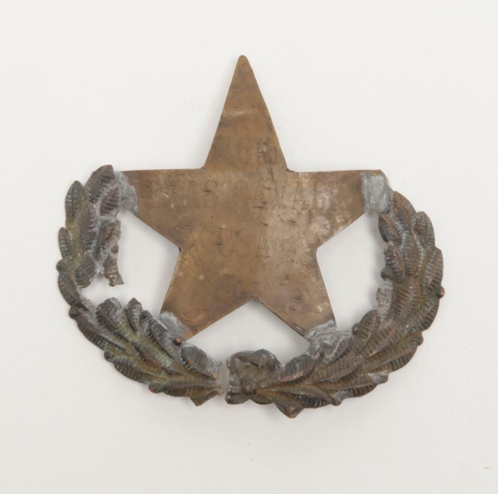 Confederate Jennifer saddle with forged iron Texas Star stirrups marked “36 Texas” remaining in fair to good original condition. Also included with this lot is a Texas hat star and two star of Texas rosettes which all belonged to Pvt. A.J. Parkerof the 36th and 32nd Texas Calvary. Two letters from noted Texas collector Gary Wiggins transfers ownership to Bill Gary on saddle and equipment. Also a photograph which has been reproduced shows Col. Woods commander of the 36th Regiment andParker at a reunion. The hat star is period scratched engraved on the reverse with ID. The William A. Gary collection consigned by his estate. Est.: $1,000-$2,000