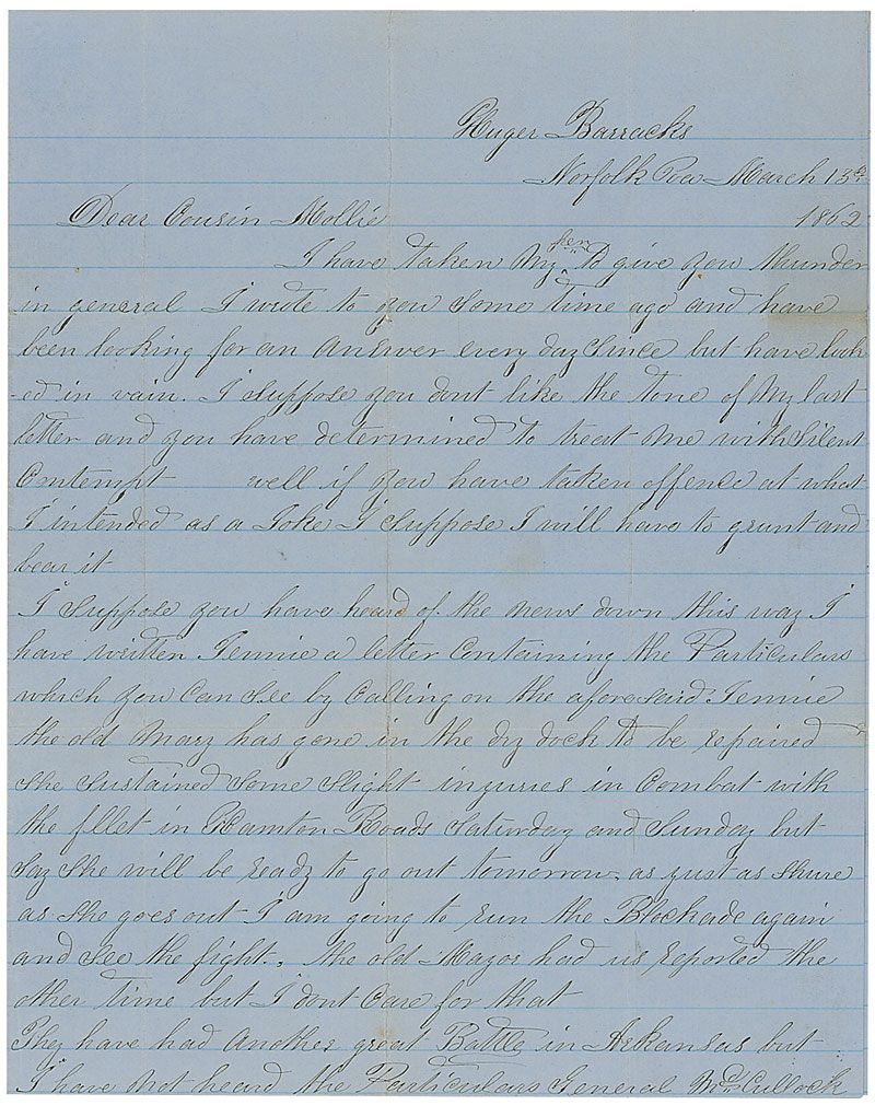 Civil War–dated ALS signed “Adolphus J. Mann,” one page, lightly-lined, 7.75 x 9.75, Huger Barracks, Norfolk, Virginia, March 13, 1862. Letter from a Confederate soldier to his cousin. In part (spelling retained): “I suppose you have heard of the news down this way…the old Mary [Merrimack] has gone in the dry dock to be repaired. She sustained some slight injuries in combat with the fllet in Hamton Roads Saturday and Sunday but say she will be ready to go out tomorrow, as just as shure a she goes out I am going to run the Blockade again and see the fight…They have had another great Battle in Arkansas but I have not heard the particulars. General McCullock and McIntosh were killed so the Day Book says and General Price wounded, but we have them surrounded, I hope that may be so…I see that the Malitia has got to repair to Norfolk and report themselves ready for service, poor fellows it will go mighty hard with them but the time has come when Virginia needs every man that can bear arms…It was reported that the Yankees have taken Newburn N. C. but report says to day we have whiped them so I dont know what to believe.” Toned intersecting folds with slight pinholes and separations at intersections, otherwise fine condition.