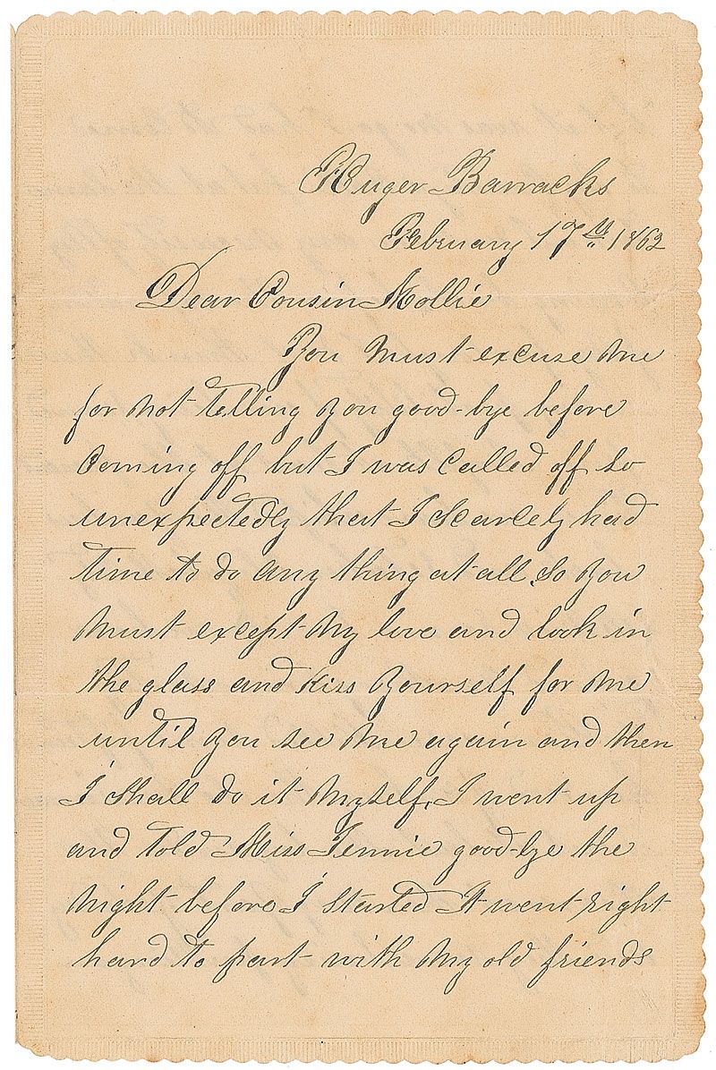ALS signed “Dolly,” one page, 4 x 6, Huger Barracks, Norfolk, Virginia, February 17, 1862. Letter from Confederate soldier Adolphus J. Mann to his cousin. In part (spelling retained): “I was called off so unexpectedly that I scarcely had time to do any thing at all…It went right hard to part with my old friends but it was no go, I had to come to my Country's call, but at the same time I don't see any necessity of my coming back before the experation of my furlough I don't think there is any probibility of our being removed from Norfolk at least at the present time. We have whiped the Yankees back and retaken Elizabeth City (so miss rumor has it). We have gained another glorious victory in Tennessee. Killed some fifteen hundred Yankees. The old Merrimac is out at last. She lay under the sheaves at the Navy Yard yesterday and they were buisy putting on her guns so she will be ready for action in a day or so, so someboddy may expect to get hurt soon.” In fine condition, with an edge chip to the second page.