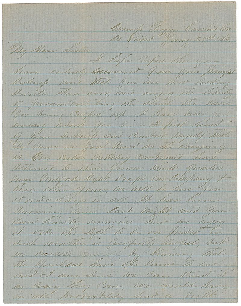War–dated ALS signed “John H. Munford,” three pages, lightly-lined on two adjoining sheets, 7.25 x 9.75, Camp Gregg, December 14, 1863. Letter to his sister a few weeks after defeating Ambrose Burnside’s forces at Fredericksburg. In part: “It has been snowing since last night, and you can hardly imagine how we enjoy it…To be on picket in such weather is perfectly awful, but we console ourselves by knowing that the Yankees have the same to endure…We had orders Monday night to hold ourselves in readiness to move to any point on the front in a moment’s notice, if the enemy should attempt to cross in our front. I think we will finish Mr. Burnsides this time, to our own and the entire satisfaction of the whole South…all we want is a good show, and I will guarantee that more Yankees will come over than will go back.” Lightly toned intersecting folds, otherwise fine condition.