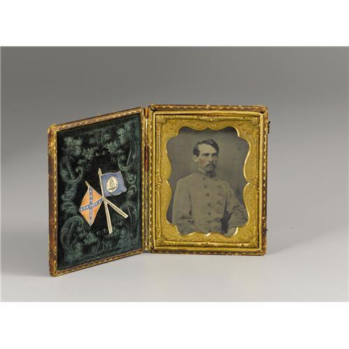 <B>Confederate Lt. Col. Walter H. Taylor 1/4th Plate Melainotype, The Only Known War Date Hard Image Of Him.</B></I> We are living in a desperate age in which the prices for Confederate hard images are skyrocketing regardless of their quality. Physically flawed and unidentified photographs of enlisted men can easily fetch hundreds of dollars in today's market. Prices for identified and/or armed rebels routinely rise to the four-figure level. With "common" Confederate photography generating such excitement, we are indeed proud to offer this superb cased tintype of Lt. Colonel Walter Herron Taylor, General Robert E. Lee's aide and the Assistant Adjutant General of the Army of Northern Virginia. The son of an ancient Virginia family, Taylor was born in Norfolk in 1838 and graduated with VMI's Class of 1857. His post-graduate business career was barely launched when interrupted by the onset of the Civil War. Obtaining a staff position with the then obscure Lee in 1861, Taylor served directly under the South's beloved icon untill war's end. When the General assumed command of the Army of Northern Virginia, Taylor's duties were broadened considerably. He handled communications to and from headquarters, enforced protocol and gathered intelligence for General Lee. His insider's position allowed Taylor to witness firsthand the grand decision-making behind the Confederate war machine. Taylor came to the general public's attention with the close of hostilities thanks to the media of the day. On April 16, 1865 a series of Brady photographs were taken at Lee's home in Richmond. The general proudly wore his Confederate uniform for the last time for this session. Among the albumen prints sold from the series was one titled "General Lee and His Staff" in which Taylor stands to Lee's left. Thanks to this commercial production Taylor was forever associated with the revered Lee. This from-life studio portrait is a refreshing departure from the albumen paper images of Taylor. This melainotype would have been taken after December 12, 1863 when Taylor was promoted to Lieutenant Colonel. He's wearing a regulation field grade officer's gray frock coat with a double row of buttons down the front. These are painted gold by the photographer, who also tinted the uniform piping a light blue. Taylor's collar carries the three stars officially reserved for a full Confederate colonel and his sleeves are decorated with twisted gold braid. The surfaces of this image are gorgeous, being free of the blistering and emulsion cracks so often present on Civil War tintypes. Additionally, the tonal contrast is of the highest quality making this picture look almost like a well-made ambrotype. The brown leather case is fairly worn and is missing one attachment hook. Overall this is a superb and unique Confederate photograph worthy of the finest institutional archive or private collection. Ex. William Turner, author of <I>Even More Confederate Faces</B></I>.<BR><BR><b>Shipping:</b> Small Collectibles (<a target="_blank" href="http://www.heritageauctions.com/common/shipping.php">view shipping information</a>)