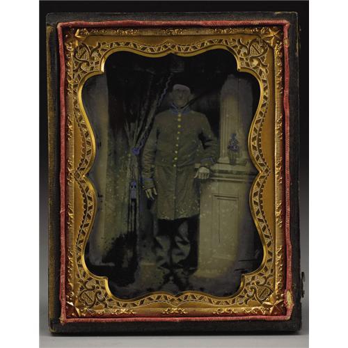 <B>Confederate Major General John Austin Wharton Ambrotype - Terry's Texas Rangers</B></I> Major General John Austin Wharton led Terry's Texas Rangers, the famed Confederate Cavalry regiment after the deaths of the regiment's former leaders, Colonel Benjamin F. Terry and Lieutenant Colonel Thomas S. Lubbock. Born in Nashville, Tennessee in 1828, Wharton moved to Texas at an early age and grew up on a plantation at Brazoria, Texas. From 1846 to 1850 he attended South Carolina College, now the University of South Carolina where he was commander of the student cadet corps. He returned to Texas and studied law under United States Senator William Preston and practiced law with Clint Terry, Benjamin F. Terry's brother at Brazoria. At the outbreak of the Civil War he owned 135 slaves in Brazoria County.<BR><BR>This ambrotype of Wharton was taken early in the war and is the only one of him at this age known to exist. Hand-tinted in its copper frame and ½ of its original leather case, there is some fading at the face, but this is undoubtedly General Wharton early in the war. On June 23, 1861 Wharton traveled to Richmond, Virginia and met with Confederate President Jefferson Davis and James Longstreet seeking permission to organize a company of Texas cavalry. Reportedly, Davis did not give his permission and Wharton returned to Texas. He passed through New Orleans and it is believed that this is where this ambrotype was taken as the backdrop is typical of the photographs from that era and place. Leaving New Orleans on a ship named the <I>Shark</B></I> bound for Texas, Wharton was captured by Union troops aboard the USS <I>South Carolina.</B></I> He was permitted to travel on to Texas by Union Commander James Alden and undoubtedly saved this ambrotype through the capture.<BR><BR>Back in Texas, Wharton was elected captain of the Terry's Ranger unit, formally known as the Eighth Texas Cavalry. After the Battle of Shiloh where he was wounded, he was promoted to Brigadier General. His bravery at the Battle of Chickamauga earned him his promotion to Major General.<BR><BR>While visiting the command of General John B. Magruder at the Fannin Hotel in Houston, Wharton quarreled with fellow Confederate officer Colonel George W. Baylor over a personal matter. Reportedly Baylor shot the unarmed General Wharton with his revolver killing him instantly. Baylor was acquitted of the killing and went on to enjoy an illustrious career as a Texas Ranger.<BR><BR>This is a very rare ambrotype of the Terry's Texas Rangers Major General from early in the war.<BR><BR><b>Shipping:</b> Miscellaneous Collectibles, Smal (<a target="_blank" href="http://www.heritageauctions.com/common/shipping.php">view shipping information</a>)