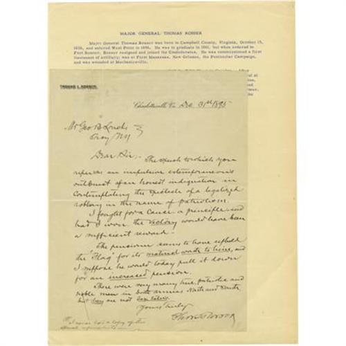 <B>Confederate Major General Thomas L. Rosser Autograph Letter Signed,</B></I> “<I>Thos Rosser,</B></I>” one page on personal letterhead, 8” x 10.5”, December 31, 1895, Charlottesville, Virginia, to George B. Louek, Troy, New York. The letter reads, “<I>The speech to which you refer was an impulsive extemporaneous outburst of an honest indignation in contemplating the spectacle of a legalized robbery in the name of patriotism. I fought for a cause, a principle and had I won, the victory would have been a sufficient reward. The pensioner seems to have upheld the 'Flag' for its material worth to him, and I suppose he would today pull it down for an increased pension. There were very many true, patriotic and noble men in both armies, North and South, but they are not tax eaters.</B></I>” Tipped-in by left margin to a collector's leaf, toned paper, very good condition.<BR>Thomas Rosser (1836 - 1910) was a true Virginia cavalier, having ended the Civil War in command of Fitz Lee's cavalry. His patriotic “indignation” in this letter was hardly mere posturing: In 1898 the aging general would serve as a brigadier in the Spanish-American War.<BR><BR><b>Shipping:</b> Flat Material, Small (<a target="_blank" href="http://www.heritageauctions.com/common/shipping.php">view shipping information</a>)