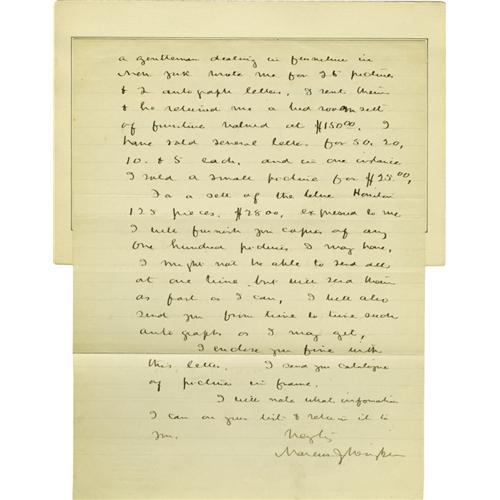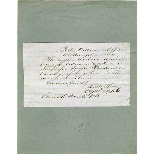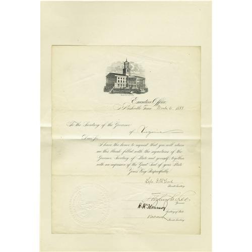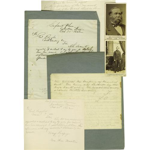<B>Confederate Military Collection.</B></I> Comprises: <B>(1) Fitzhugh Lee.</B></I> Partly Printed Letter Signed: "<I>Fitzhugh Lee</B></I>" as Governor of Virginia, one page, 9.5" x 12". Nashville, Tennessee, March 6, 1889. Interesting letter from L. P. McCord, as Private Secretary to the Governor of Tennessee, to the Secretary of the Governor of Virginia asking that the blank lower portion of this letter be "<I>filled with the signatures of the Governor, Secretary of State and yourself, together with an impression of the Great Seal of your State.</B></I>" Also signed by Virginia Secretary of State "<I>H. W. Flournoy</B></I>" with the word "<I>Vacant</B></I>" penned by Governor Lee on the line reserved for the signature of his Private Secretary. The embossed seal of Virginia is to the left of the signatures. Tipped to a larger page. Grandson of General "Light Horse Harry" Lee and the nephew of General Robert E. Lee, General Fitzhugh Lee was Governor of Virginia from 1886-1890. During the Civil War, Lee rose to the rank of Major General in 1863. <B>(2) Roy Mason Hooe.</B></I> Autograph Letter Signed: "<I>R. M. Hooe/Capt & A.A.G.</B></I>", one page, 7.5" x 4.5". Corinth, Mississippi , March 13th 1862 . To the Ordnance Office at Memphis, Tennessee. In full: "<I>Have you received requisitions for ordnance & ordnance Stores for Major Baskerville's Cavalry, if so where is the ammunition. Answer quickly.</B></I>" Affixed to 8.5" x 11" page. On March 12, 1862, the following message was sent to Capt. Hooe by Col. Alfred Moulton, 18th Regiment Louisiana Volunteers, Commanding 4th Brigade, C.S. Forces, Mississippi Valley: "A mounted courier has just reached me with a verbal message from Major Baskerville, stating that the enemy had landed a force at Crump's Landing 18,000 strong, firing upon the cavalry pickets, driving them in." Ergo, "<I>Answer quickly."</B></I> <B>(3) Marcus J. Wright.</B></I> Autograph Letter Signed: "<I>Marcus J. Wright</B></I>", two pages, 8" x 10.5". War Department, Washington, October 7, 1891. Wright tells Mr. A.E. Allen that "<I>I am in no sense a dealer in Confederate pictures - autographs or anything else of the kind</B></I>" then continues by telling him of the framed pictures he has and how he traded "<I>25 pictures & 2 autograph letters</B></I>" for "<I>a bed room set of furniture valued at $150.00.</B></I>" Tipped to another page. In April, 1862, General Marcus J. Wright was wounded at the Battle of Shiloh. He served on General Benjamin F. Cheatham's staff during the Kentucky campaign from June to September 1862. In 1863-1864, General Wright was in charge of the district of Atlanta until its evacuation. <B>(4) George W. Martin.</B></I> ALS: "<I>Geo Wm Martin</B></I>," one page, 7.75" x 10". Confederate House, Jackson, Miss., October 26, 1862. Informing General Ruggles that he has received the documents sent. Affixed to 8.5" x 11" page. With unsigned carte-de-visite photographs of Wade Hampton and P.G.T. Beauregard. Also, the received copy of a May 4, 1863, telegram from General A. Buford in Jackson to General Ruggles in Columbus, 5.5" x 8", to send "<I>by railroad with dispatch the mounted companies of third Ky. By order of Pemberton.</B></I>" Tipped to larger page. Seven items.<BR><BR><b>Shipping:</b> Small Flat (<a target="_blank" href="http://www.heritageauctions.com/common/shipping.php">view shipping information</a>)