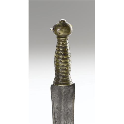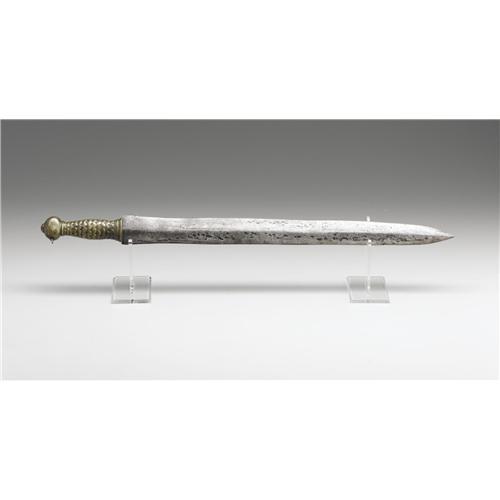 <B>Confederate Naval Cutlass Marked "WMF",</B></I> possibly "Wilmington Marine Force" at the Wilmington, North Carolina Naval Yard. An unmarked weapon similar to Leech & Rigdon products and likely manufactured by that firm. 26" overall length with a 21" blade. Constructed of a cast brass scaled grip with integral pommel affixed to the blade. Remnants of a guard extend from the pommel. Whether this element was intentionally removed or not is questionable. Leech & Rigdon did, in fact, produce cutlasses without a guard. The pommel is neatly incised with the initials, WMF. Numerous file marks on blade. Good metal with excellent old toning throughout. Very good condition.<BR><BR><b>Shipping:</b> Large Collectibles (<a target="_blank" href="http://www.heritageauctions.com/common/shipping.php">view shipping information</a>) <BR><BR><B>Important noti
