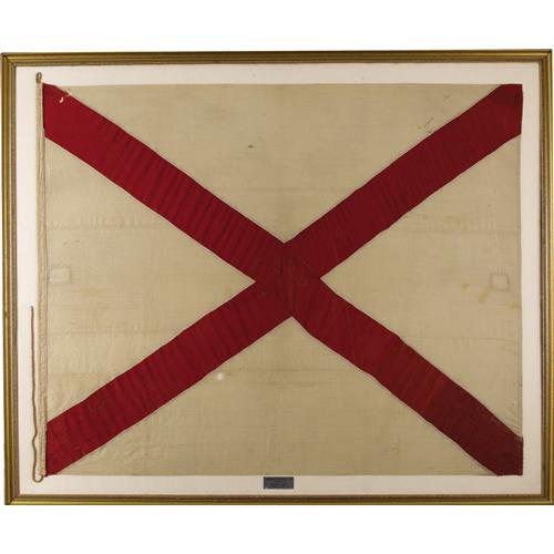 <B>Confederate Naval Signal Flag - Captured at Fort Morgan, Alabama, in 1864</B></I> A Confederate made naval style signed flag signifying “guard.” Captured with the surrender of Fort Morgan in Mobile Bay near Mobile, Alabama, August 23, 1864.<BR><BR>Under the early light of dawn on August 5, 1864, Union Admiral David Farragut led a flotilla of 14 wooden ships, four ironclads, and numerous gunboats into Mobile Bay to seal off the city of Mobile, one of the two remaining Confederate ports. While entering the bay, the Union monitor <I>USS Tecumseh</B></I> struck a submerged torpedo and sank. Under fire from both the Confederate fleet and Fort Morgan, Farragut had to choose between retreating or risking the minefield. He then issued his famous order, “Damn the torpedoes! Full speed ahead!”<BR><BR>Passing the minefield safely, Union ships defeated the Southern flotilla, while Union ground forces captured the forts. Although the city of Mobile remained in Confederate hands, the last blockade-running port on the Gulf Coast east of the Mississippi was closed.<BR><BR><B>Authentication:</B></I> Flag consists of a white wool and bunting field, pieced horizontally in each quadrant formed by the red wool bunting St. Andrew's cross 7 ½” to 8” wide, inset into the field. Flag measures 65” on its hoist by 81” on its fly, including the 1 1/4” wide white (turned tan) heading that serves as a sleeve for a single halyard rope attachment, lopped into an eyelet at the top and extended 30” at the bottom. Flag shows service and bears at least five patches to cover previous damage.<BR><BR>Letters of authenticity and research from renowned Civil War flag expert and author Howard Madaus.<BR><BR><B>Provenance:</B></I> <I>Crow Art Partnership Collection (Dallas, Texas) <BR><BR>Formerly in the collection of George Wray of Atlanta, Georgia</B></I>*****<BR><BR><b>Shipping:</b> Requires 3rd Party Shipping (<a target="_blank" href="http://www.heritageauctions.com/common/shipping.php">view shipping information</a>)