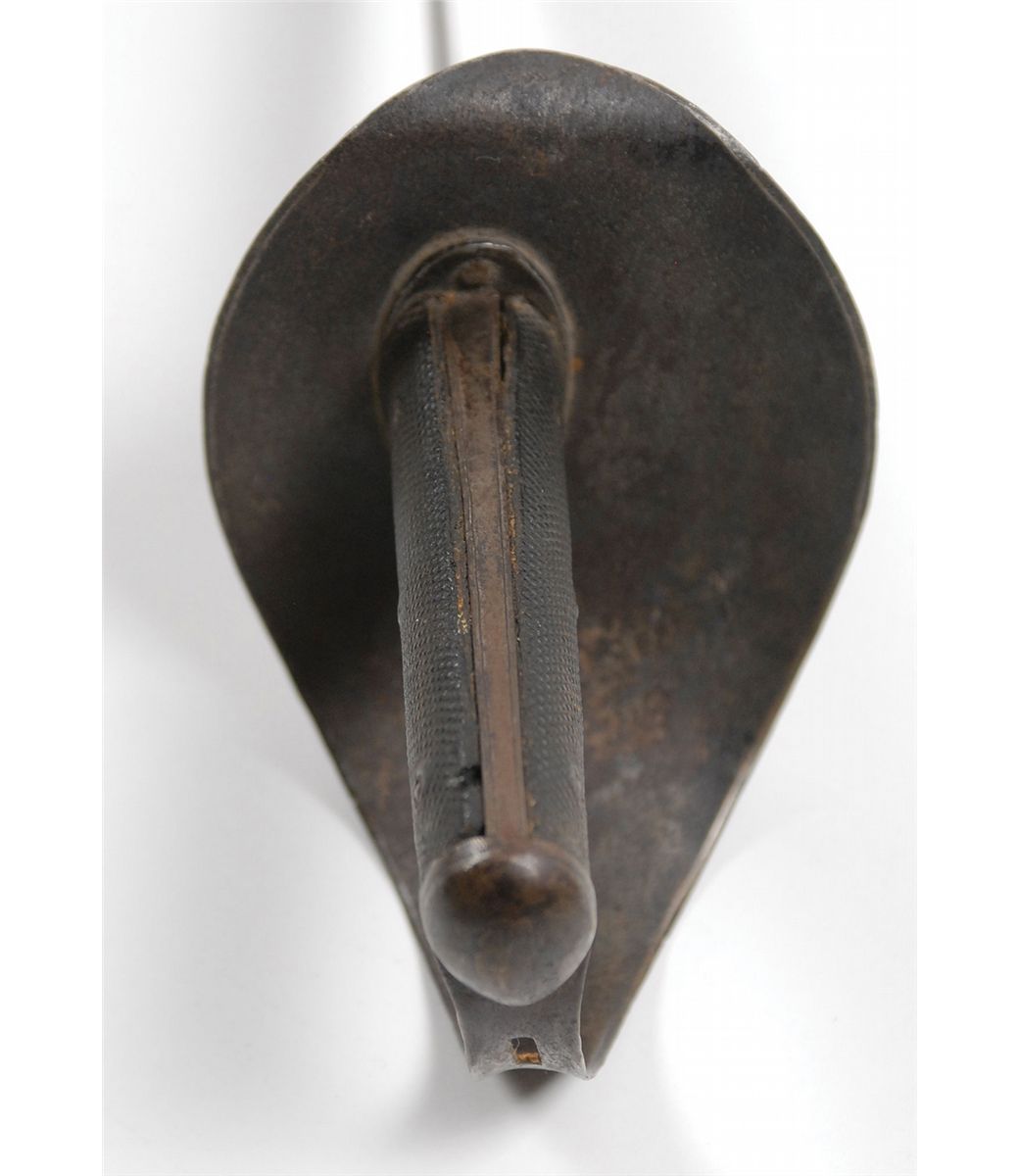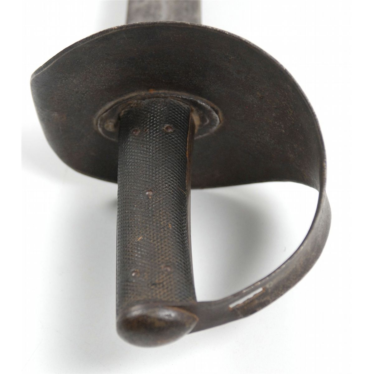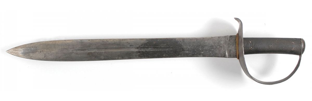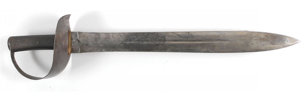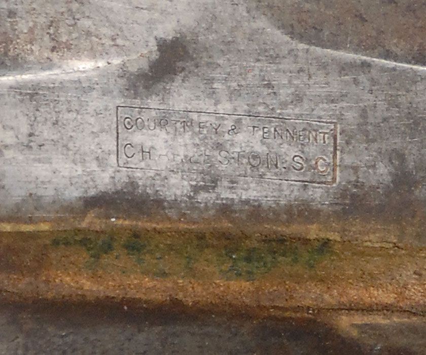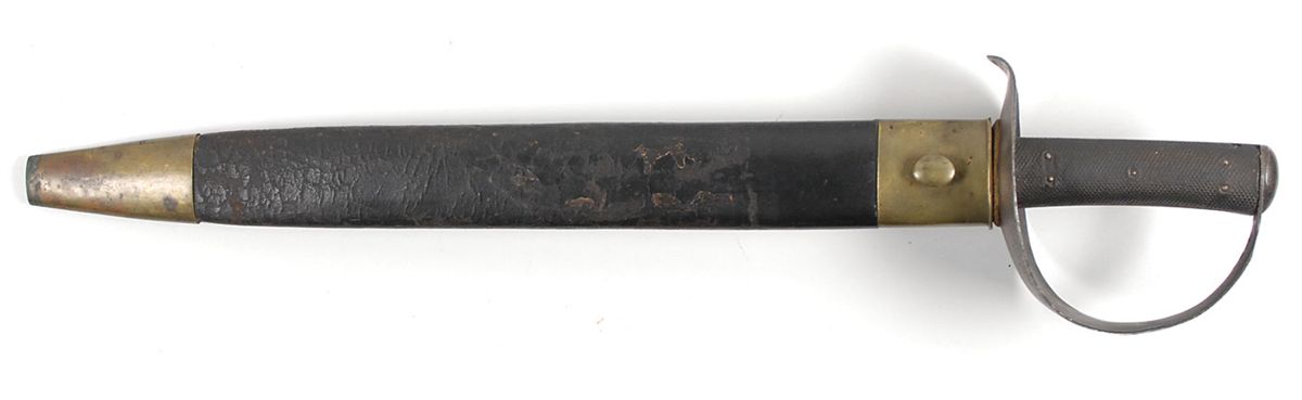 Courtney and Tennant, Charleston SC. marked Confederate navy cutlass. This piece was built by Robert Mole in England and acquired for the Confederacy by George Tennant who was the agent for the Confederate Navy. This piece shows an 18.75? excellent blade. There is one area of fine pitting on both sides of the blade and some staining. The original washer is in place. Mole is correctly stamped as is the Courtney and Tennant marking. The black checkered grips are original and rate very good to excellent. The black leather scabbard is complete and rates excellent with only some age and surface crazing. The seams are solid with unpolished brass fittings. The uppermost 2.5? of the scabbard is in perfect condition, as it was protected by the frog. This piece is overall 24? and is one of the scarcer cutlasses as fitted with the full iron guard. This piece is in its as found condition, it has not been cleaned or polished. An excellent example for the serious Confederate naval collector.