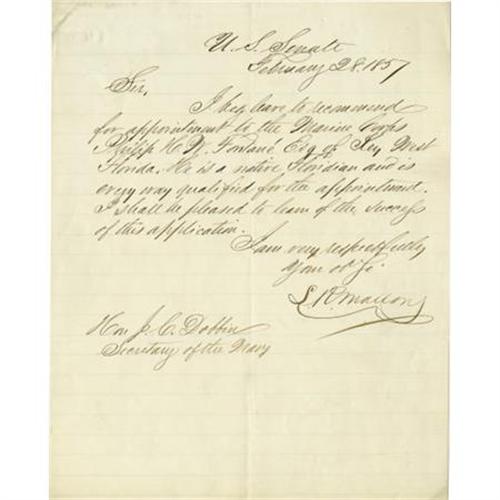 <B>Confederate Navy Secretary Stephen Mallory Pre-War Autograph Letter Signed,</B></I> “<I>S. Mallory,</B></I> one page, 7.75” x 9.5”, Washington, D.C., February 27, 1857, to Secretary of the Navy J. C. Dobbin. The letter reads, “<I>I beg leave to recommend for appointment to the Marine Corps Philip H. Fontane Esq. Of Key West Florida. He is a native Floridian and is every way qualified for the appointment. I shall be pleased to learn the success of his application.</B></I>” Very fine condition.<BR>A few short years after this was penned, Mallory was appointed Confederate Secretary of the Navy. The former U.S. Senator from Florida served admirably in that capacity for the duration of the Civil War, actually building an effective navy from scratch.<BR><BR><b>Shipping:</b> Flat Material, Small (<a target="_blank" href="http://www.heritageauctions.com/common/shipping.php">view shipping information</a>)