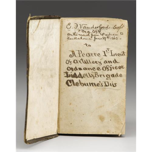 <B>Confederate New Testament With Diary-like Notations.</B></I> "<I>C. F. Vanderford, Capt. and Ord. Officer on the march from Wartrace to Tullahoma June 27, 1863 to A. Pearre 1st Lieut. Of Artillery and Ordnance Officer Liddell's Brigade, Cleburne's Div.</B></I>" The New Testament was published by the American Bible Society, N.Y., 1862. It has a broken spine and no back cover, but the contents are very good. Throughout this book Pearre gives the locations - and sometimes a few details of where he was or what was going on when he read a particular passage! Pearre is pictured in <I>Confederate Faces,</B></I> page 152 and mentioned in <I>Cleburne and his Command</B></I> by Buck. Pearre was a Marylander and had a fantastic history. A very interesting item - a transcription of his "notes" are provided as well as other history.<BR><BR><b>Shipping:</b> Books & Catalogs (<a target="_blank" href="http://www.heritageauctions.com/common/shipping.php">view shipping information</a>)