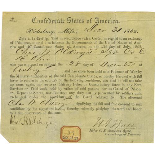 <B>Confederate Parole For Union Prisoner At Vicksburg.</B></I> Partially printed document, one page, 6" x 5.5", Vicksburg, Mississippi, December 31, 1862. Sergeant Charles W. Oldroyd, Co. C, 16th Ohio Infantry signs this parole some three days after his capture by Confederate forces at Anbry, Mississippi during the campaign at Chickasaw Bayou. The document is co-signed by a Major N.G. Watts, C.S.A. Printed on coarse grey Confederate stock. One clipped corner, two reinforced folds and an old library or museum identification tag on the face. Overall very good condition.<BR><BR><b>Shipping:</b> Small Flat (<a target="_blank" href="http://www.heritageauctions.com/common/shipping.php">view shipping information</a>)