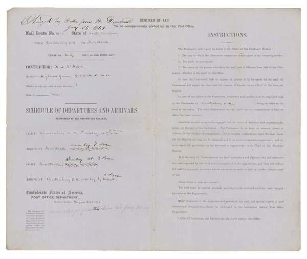 Partially Printed Document. Two pages, 8 1/2”x 13 7/8. Confederate States of American Post Office Department, Contract Bureau. August 22, 1863. The document lists L.D. McMakin as the contractor for Mail Route # 1966 from Spartanburg to Morrittsville, [?] South Carolina. It also lists the route’s schedule and provides printed instructions regarding the Postmaster’s responsibility as regards contractors.