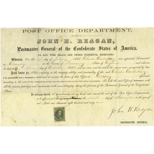<B>Confederate Postmaster General John H. Reagan.</B></I> This appointment certificate of a postmaster is signed by Confederate Postmaster General John H. Reagan. Dated July 27, 1861, he appoints Charles Canterbury as the postmaster to Craney, Virginia in Wyoming County. The document measures 12" x 7.5" and has been slightly reduced and shows slight foxing. Included at the bottom of the certificate is a Confederate five-cents postage stamp. John H. Reagan was famous for his efficient administration of the Confederate Postal Service, which actually turned a profit. This was due in part to the fact that at the outbreak of the Civil War he recruited many of the US Postal Service employees at Washington DC who came to serve with him, many bringing their official records with them.<BR><BR><b>Shipping:</b> Large Flat (<a target="_blank" href="http://www.heritageauctions.com/common/shipping.php">view shipping information</a>)