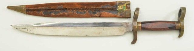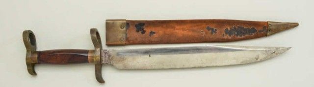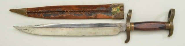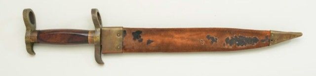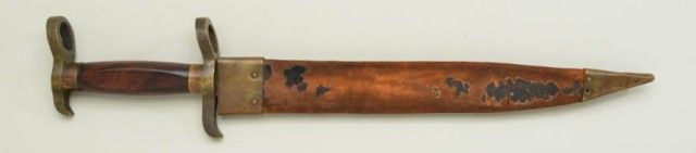 Confederate Potts type Bowie knife/bayonet in exceptional condition with periods scabbard. The blade measures 12-1/4” nearly 17-1/4” overall. The blade is its original full dimensions with some light cleaning and minor pitting. The grip is an American hardwood, shows a couple of minor chips. The brass portion shows a deep patina and no cleaning in many years. The brass mounted military style scabbard shows flaking and wear, butseem is good and mounts show a matching patina to the hilt (the scabbard is a period marriage and used with this knife, but not originally intended for it) The nicest of this type we have seen in a long while. Est.; $2,000-$4,000.