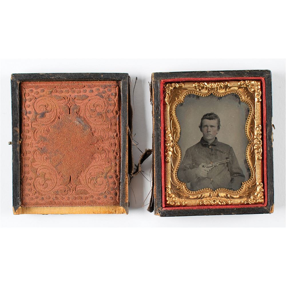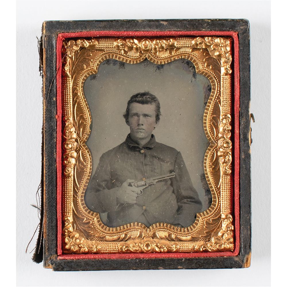 Appealing original ninth-plate-size tintype (2" x 2.5") of a Confederate soldier in his standard shell jacket, posing with his revolver across his chest and a serious look on his face. Housed in its original case with detached lid. In very good condition, with some fraying to the case, and one thin wooden section missing from the lid.