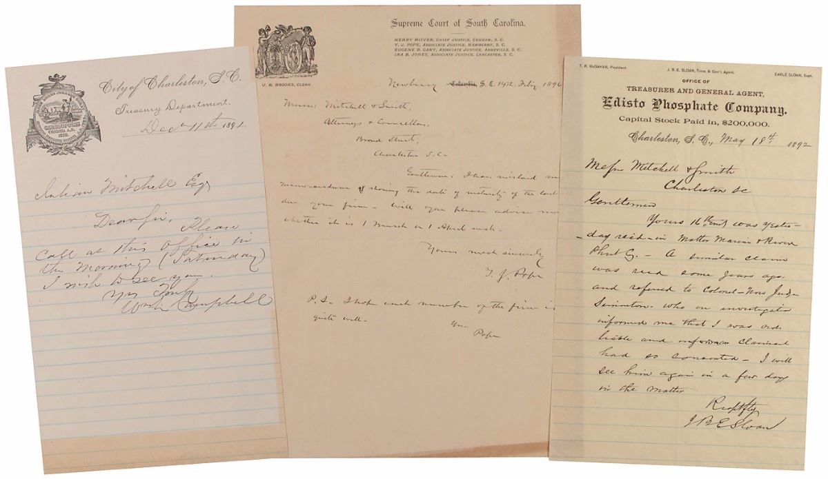 Three one-page ALSs, various sizes, all dated between 1891–1896, and signed by former Confederate soldiers Colonel J. B. E. Sloan, Young John Pope, and William Campbell. Sloan’s letter, on Edisto Phosphate Company letterhead, reads, in part: “A similar claim was rec’d some years ago, and referred to Colonel–now Judge Simonston who on investigation informed me that I was not liable and informed claimant.” Expected toning and folds, otherwise fine condition.