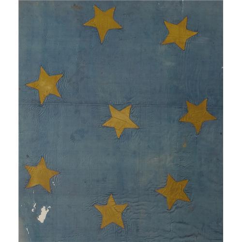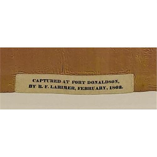 <B>Confederate 'Stars and Bars' 18th Tennessee Infantry Flag; Captured at Fort Donelson.</B></I> This striking and beautiful silk Confederate Stars and Bars of the 18th Tennessee Infantry was captured at the surrender of Fort Donelson on February 15, 1862 by Sergeant R. F. Larimer of the 66th Illinois Infantry (Birge's Western Sharpshooters). The Congress of the Provisional Government of the Confederate States adopted this design, known as the Confederate First National flag, on May 4, 1861. First National flag design implementations varied greatly, especially since they were hand sewn and due to the fact that additional stars for new Confederate states were being added as they left the Union. In this First National flag the style is classical, true to the intent of the Confederate Congress with the circle of white stars in the upper left on the blue field, 7 for the original seven seceding states and the 8th for Virginia, dating this flag to sometime after May 7, 1861. <BR><BR>In the first great victory for the North, this fine example fell into the hands of Union troops, specifically Sergeant R. F. Larimer (as noted in an Adjutant General's report), about whom we know quite a lot. Born in Scioto County, Ohio on October 27, 1838 he began farming with his brother, eventually purchasing a half-interest in a sawmill. After the outbreak of the war, in August 1861 he rushed out to join an elite unit being formed at Paris, Illinois, Birge's Western Sharpshooters, later named the 66th Illinois Infantry. One had to be an able marksman to make it into the unit led by Colonel John W. Birge as it was soon off to war and action at the Battle of Fort Donelson, the Union's first great victory. <BR><BR>The 18th Tennessee Infantry was there waiting. Mustered into service the same month as their adversaries in the 66th Illinois, the Tennessee forces were under the command of Confederate General Simon Bolivar Buckner. In the early afternoon of February 14, 1862 the Federal ironclads <I>St. Louis,</B></I> <I>Pittsburgh,</B></I> <I>Louisville</B></I> and <I>Carondelet</B></I> began shelling the fort. Using the eleven big guns in their water batteries, the southern forces repulsed the gunboat fleet under the command of Union flag officer Andrew H. Foote, wounding Foote during the retreat. <BR><BR>The southern celebration was short-lived. The Union infantry, led by General Ulysses S. Grant was being reinforced, quickly cutting off the Confederates' possible escape route from the fort. Seizing the opportunity to evacuate some of the troops, Confederate Generals John Floyd, Gideon Pillow, and Bushrod Johnson left Buckner in command and took some 2,000 men and headed toward Nashville. Confederate Cavalryman Colonel Nathan Bedford Forrest led additional troops across the Lick River to safety. Seeing this, Grant retook any ground lost earlier and demanded the surrender of the fort. Vastly outnumbered and seemingly doomed, General Buckner asked for terms of the surrender. Grant would reply that there would only be one type of surrender that day, "unconditional." From that day the 18th Tennessee and their comrades were taken prisoner and their flag captured, Ulysses S. Grant would be the first hero of the Union with a new nickname, "U. S." (unconditional surrender) Grant. It was at this point that Sergeant Larimer came into possession of the flag seen here today. <BR><BR>The members of the 18th Tennessee would spend seven months in Union prisoner of war camps until exchanged to fight again. They had lost 52 men at Fort Donelson but would lose hundreds more later on at Chickamauga and other battles before being paroled in May 1865. <BR><BR>This elegant Confederate First National flag, the Stars and Bars of the Confederacy, is constructed of two layers of silk. The overall dimensions are 59" on its hoist and 106" on its fly. The blue canton measures 39.25" on the hoist and 34.5" on the fly. The canton is decorated with eight five-pointed stars arranged in a circle of seven with the eighth star in the center. The stars are appliquéd to each side of the canton using a lockstitch machine on the obverse, the reverse using hand stitching. The stars measure 5.25" to 5.5" across their points. The flag's field is composed of three horizontal silk bars, the upper red one measuring 19.625" wide, the center white and 19.5" wide and the lower red one 19.75" wide. All are hand sewn and hemmed around the periphery of the flag. Thirteen pairs of faded red silk ties, each about .875" wide and about 5" long are equally spaced for use in securing the flag to its staff. In the center of the bottom bar on each side is appliquéd a 1.5" x 9.375" white cotton label stamped with "CAPTURED AT FORT DONALDSON sic ,/ BY R. F. LARIMER, FEBRUARY, 1862." The overall condition of the flag is good with small silk fractures on the fly end. There are some fold holes in a vertical line through the bars about 26" from the fly end. The canton has a 1" x 3" hole just under the lower leading-edge star with about five smaller holes adjacent to it. <BR><BR>The flag has been researched and authenticated by Howard Madaus, the distinguished expert and author on Civil War flags. It has been conserved by Fonda Thomson and is housed in a protective archival frame for display by Thomson as well. An archive of research concerning the flag, both regiments and Sergeant Larimer accompanies the banner. Sergeant Larimer fought on throughout the South's bloodiest battles, his younger brother being killed at Kennesaw Mountain. His application for an invalid pension after the war states his reasons for disability as "rheumatism and heart disease contracted at Fort Donelson in 1862." He died in 1908. <BR><BR>This Confederate First National Stars and Bars was present at a historic time during the Civil War, fought under and seized by brave men both North and South. Noted Civil War expert and author Howard Madaus' research and authentication accompany this flag.<BR><BR><b>Sh