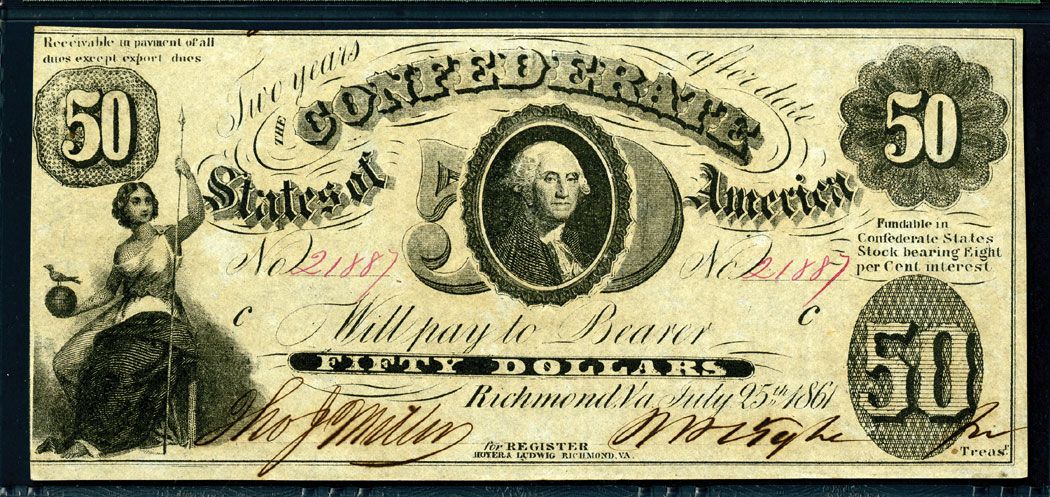 Richmond, Virginia, July 25th, 1861, S/N 21887, George Washington center, Seated Liberty and Spear at left, back blank, Issued and uncanclled, PMG graded Extremely Fine 40. Very attractive for issue. Annotations in pencil noted on back. H&L.