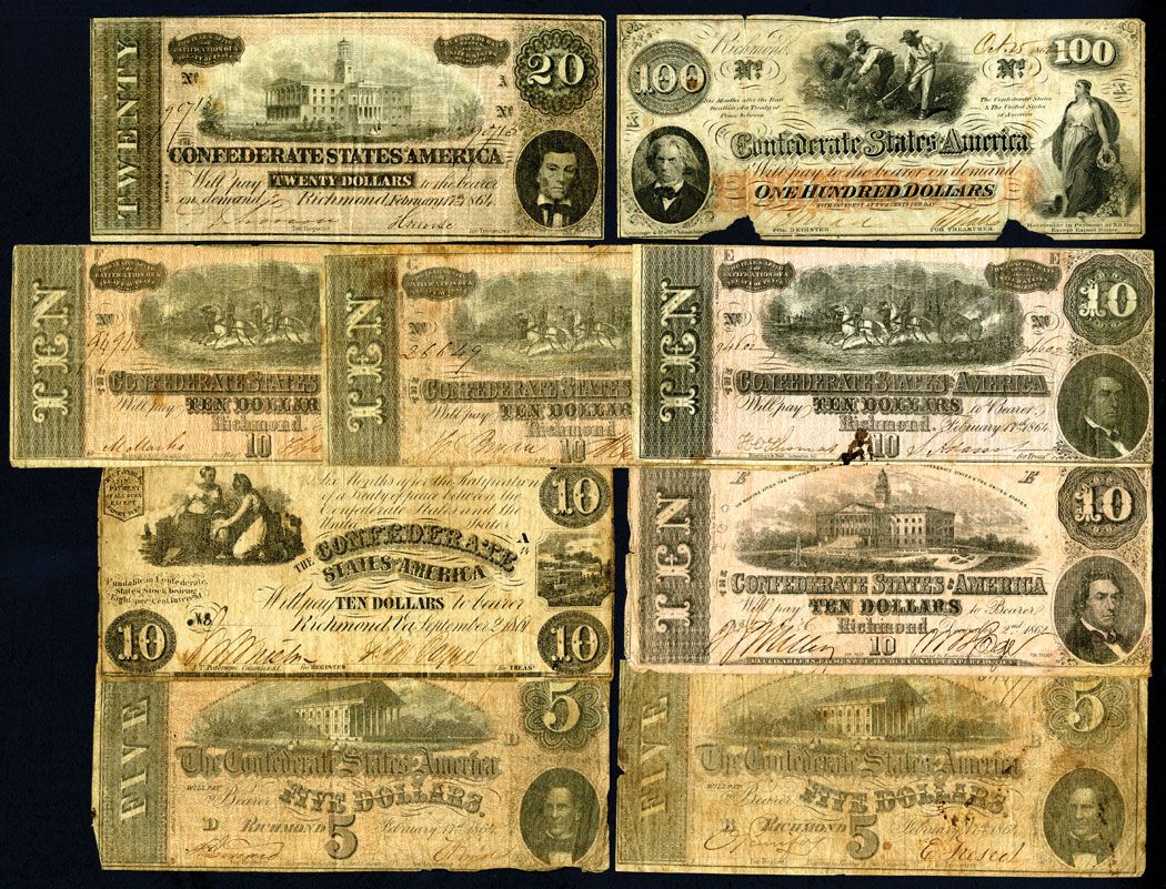 Virginia, Lot of 9 notes, Includes T-28, $10, 1861, VG; T-52, $10, 1862, Fine with small edge faults; T-41, $100, 1862, Fine with small pieces missing from folding wear and 1864 issues, $5 (2); $10 (3) and $20, VG to Fine. Useful dealer assortment.