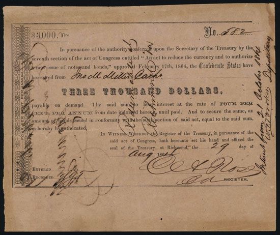 Virginia, August 29th, 1864, $3000, 4% Issued and Uncancelled Call Certificate, #582, Handwriting on bond reads ÒRedeemable at Richmond, Va.Ó, Fine condition. Note was issued to reduce the outstanding currency amount. Printed by Ritchie & Dunnavant. Ball Confederate Bond catalogue #347 rarity 6-.