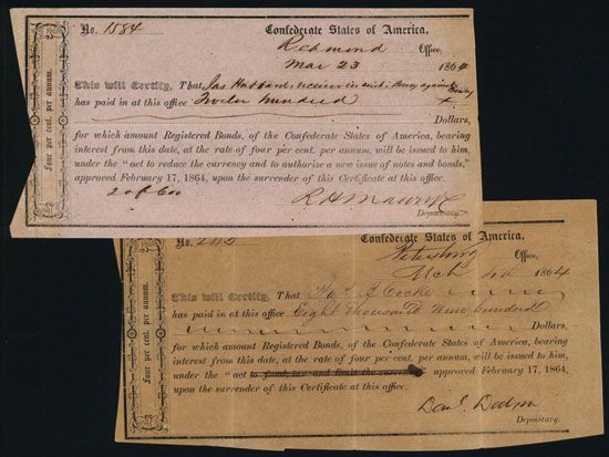 Richmond and Petersburg, Virginia, 1864, $1200 and $8900, Issued and Uncancelled lot of 2 bond receipts for conversion of outstanding debt to 4% debt, #'s 1584 and 243, Black print on pink and brown paper, Fine condition with minor creases along fold lines.