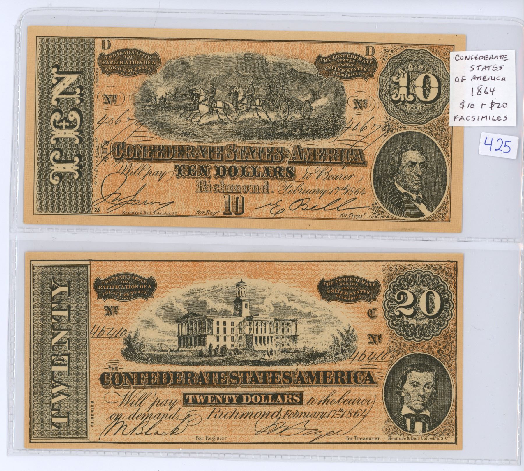 Confederate States of America. Lot of 2 facsimile notes dated 1864 for $10 & $20. None of these notes are real. AU.