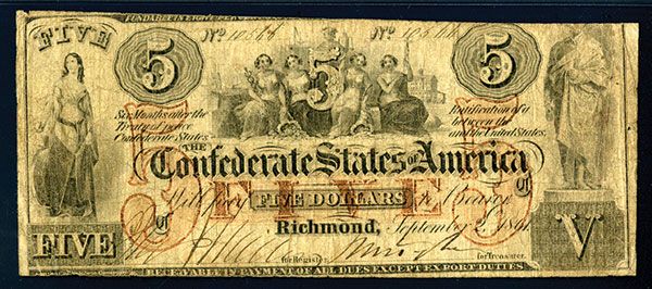Richmond, Virginia, September 2, 1861, $5, T-31, Issued banknote, Black with red protector, back blank, pp C, S/N 10566, PMG graded Choice Fine 15 NET with note of minor rust, Attractive note and scarcer variety.