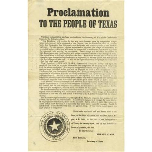 <B>Confederate Texas Recruitment Broadside</B></I> Signed in type "<I>Edward Clark</B></I>" as Governor of Texas, one page, 8" x 12.5". Austin, August 26, 1861. In part: "<I>Whereas, A requisition has been received from the Secretary of War of the Confederate States, to the following effect: 'You [sic] Excellency will receive, for the war, two thousand men, by independent companies, each company to be composed of one Captain, one 1st Lieutenant, two 2d Lieutenants, four Sergeants, four Corporals, two Musicians, and from sixty-four to one hundred privates...' Now, therefore, I, Edward Clark, Governor of Texas, do hereby call upon the people of this State, to organize themselves into companies, for the purpose of complying with the above requisition. You require no appeal to animate your patriotism...You are now engaged in a struggle for your liberty. Of its propitious termination, there can be no doubt; but in order to make the contest decisive, and of short duration, it is necessary that your most powerful energies should be called forth. Then should every man be up and doing. If you want a speedy peace, you must be prepared to conquer it.</B></I>" Docketed on verso: "<I>Proclamation / of Gov. of Texas / Call for /2000 men / 10 Co. Infantry / 4 Artillery / 3 Sept.</B></I>" Early recruitment broadsides are scarce, examples of the Texan variety are near impossible to find. In near fine condition.<BR><BR><b>Shipping:</b> Flat Material, Small (<a target="_blank" href="http://www.heritageauctions.com/common/shipping.php">view shipping information</a>)