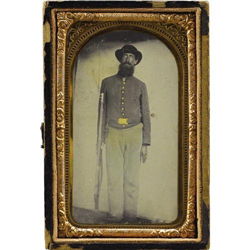 <B>Cased Confederate Tintype of an Armed Infantryman.</B></I> Although not positively identified as such, the subject of this 2" x 3.5" studio portrait simply screams "rebel!" He wears a typically Confederate black slouch hat, a grey shell jacket, and what appears to be a Southern state seal sword belt plate. The photographer has painted the buttons and plate gold; however, an oval border within the rectangular plate seems to be peeking through the gilt. The soldier depicted here stands at attention with a bayonet affixed to his musket. Under glass within a brass mat and half-cased with a missing lid. The image and mat are in excellent condition.<BR><BR><b>Shipping:</b> Miscellaneous Collectibles, Smal (<a target="_blank" href="http://www.heritageauctions.com/common/shipping.php">view shipping information</a>)