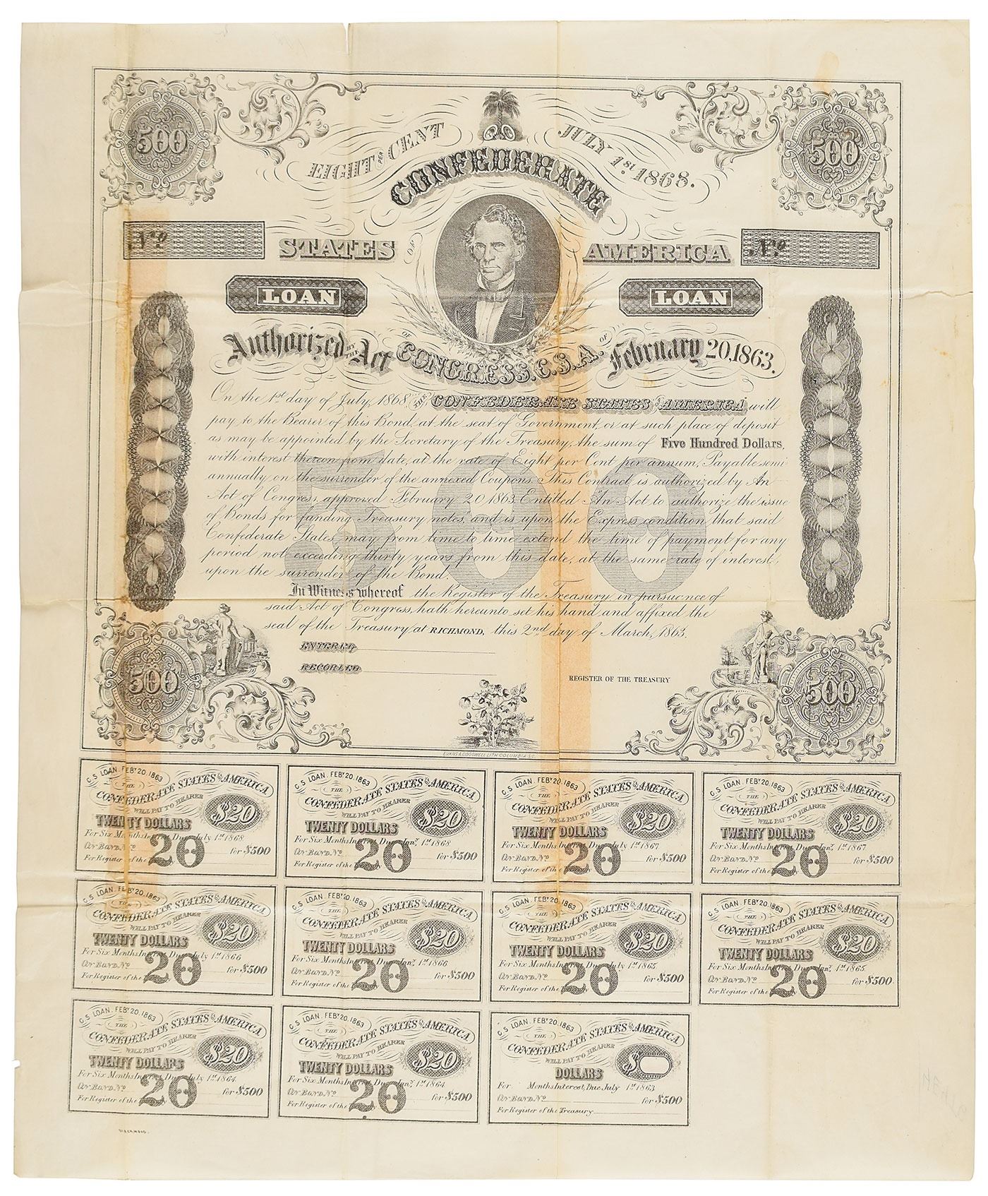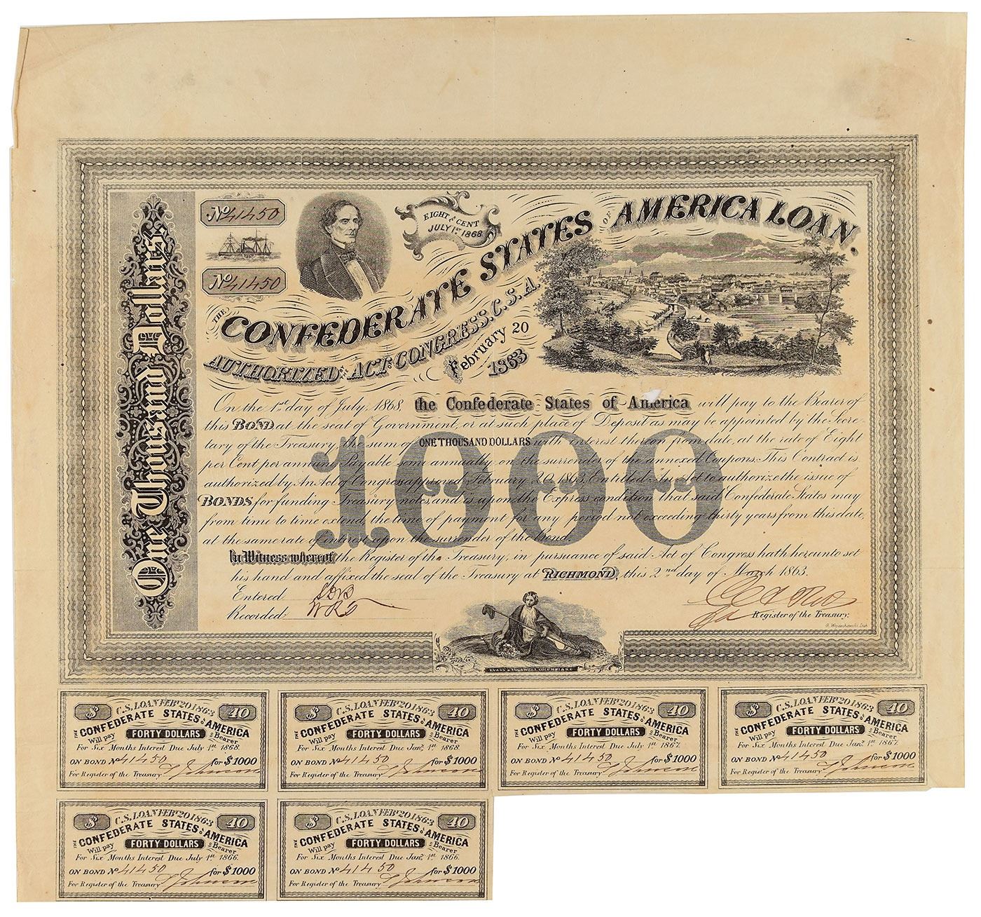 Two Confederate bonds: a blank certificate for a $500 bond issued by the CSA Treasury at Richmond on March 2, 1863, one page, 14 x 16.75, offering 8% interest maturing on July 1, 1868, with all coupons intact; and a certificate for a $1000 bond issued by the CSA Treasury at Richmond on March 2, 1863, one page, 15 x 13.75, offering 8% interest maturing on July 1, 1868, with six coupons intact. In very good to fine condition, with several edge tears, and show-through from old tape on the back of splits folds, to the $500 bond.