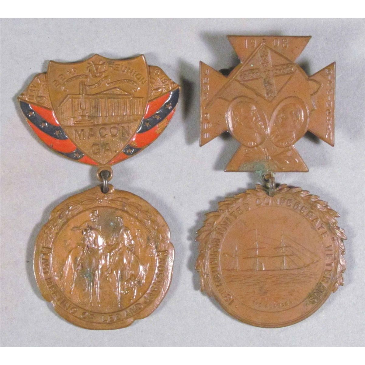 Confederate Veterans Badges. Macon, GA, 22nd Reunion-Last meeting of Lee and Jackson. 18th Reunion United Confer ate Veterans dated 1908. Both in very good original condition. Approx. 3 inches tall. Start Price $20