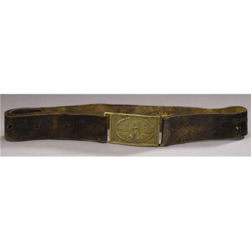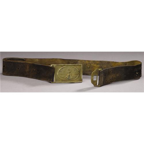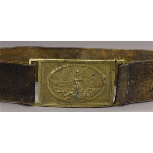 <B>Virginia Sword Belt Plate On Leather,</B></I> 88mm x 51mm, cast and die-stamped brass, ca. late 1850s - 1861. See Plate 434 in <I>Confederate Belt Buckles and Plates</B></I> by Steve E. Mullinax. Following the general form of the Model 1851 U. S. sword belt plate, the face of this prewar plate displays the Virginia State Seal within an oblong oval cartouche set against a stippled background. The Roman personification of Virtue, Virtus, is shown standing over a defeated Tyranny. This device, used by Virginia since 1776, would have seemed especially appropriate to her volunteer forces of 1861. The plate's back and keeper are both stamped with the benchmark “219”, indicating an original pairing since the day they were made. The plate is affixed to a russet leather belt and has a brass ring stitched to its back. An unusual feature of this particular specimen is that the plate's tongue has been repaired with two copper rivets set into pre-drilled holes. All brass elements in this rig enjoy a natural old toning. The leather is somewhat stiff, yet remains solid.<BR><BR><B>Provenance:</B></I>The Tharpe Collection of American Military History from Norm Flayderman.<BR><BR><B>Exhibited:</B></I> The Liberty Heritage Society Museum.<BR><BR><b>Shipping:</b> Miscellaneous Collectibles, Smal (<a target="_blank" href="http://www.heritageauctions.com/common/shipping.php">view shipping information</a>)