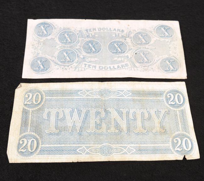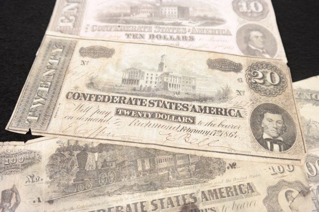 Four Confederate notes, two Georgia notes, and one Virginia $1 note. Average Good to Very Good. Total 7 notes.