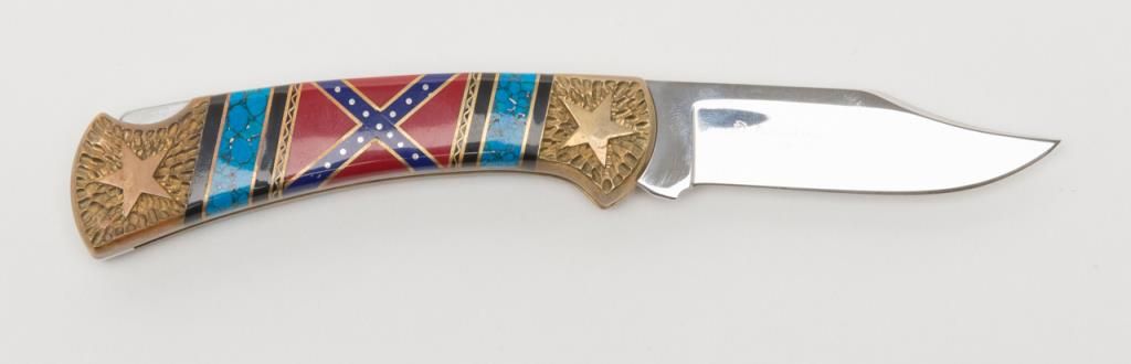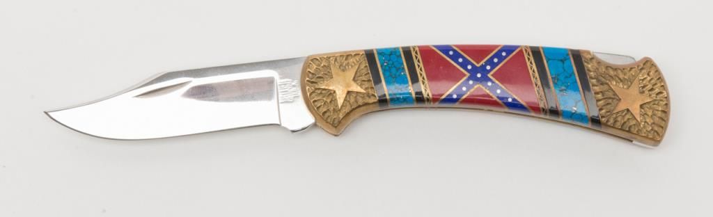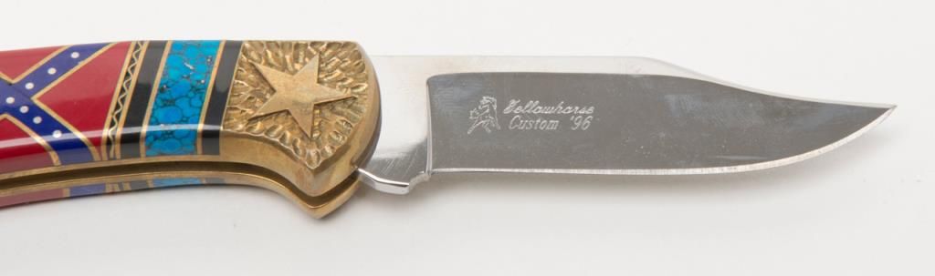 Confederate flag custom knife by Navajo artist David Yellow Horse dated 1996 in display case. Est.: $250-$500.