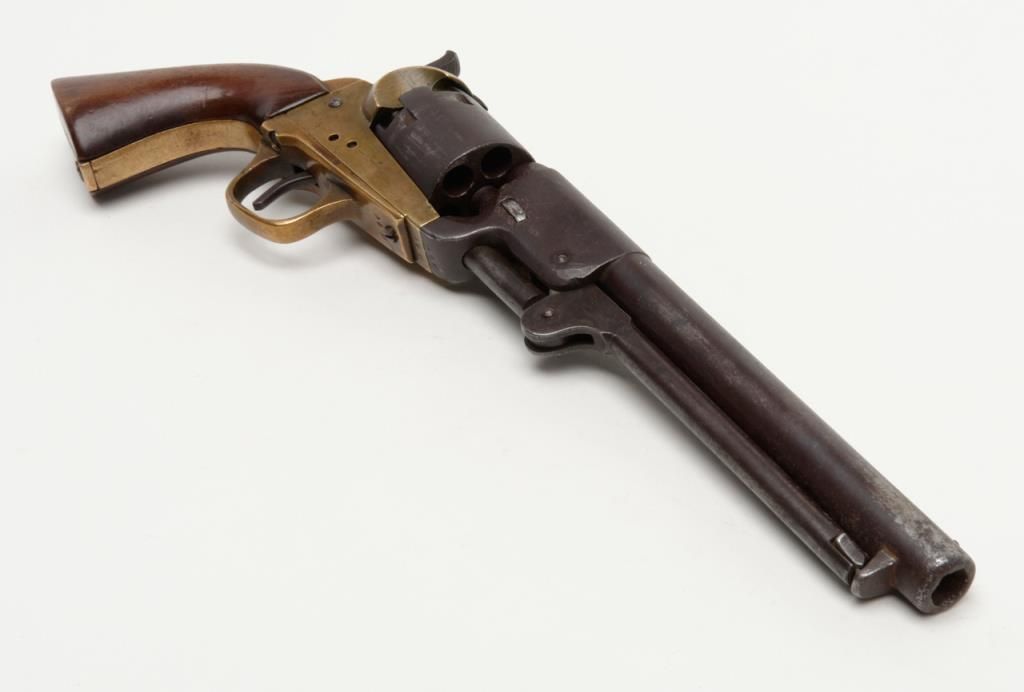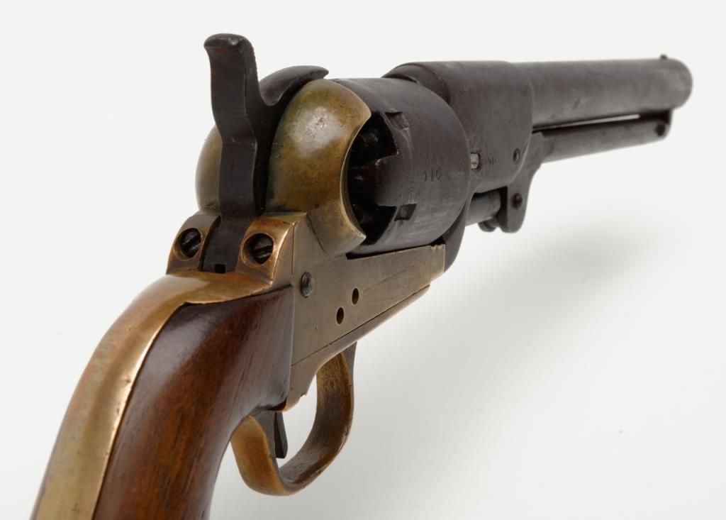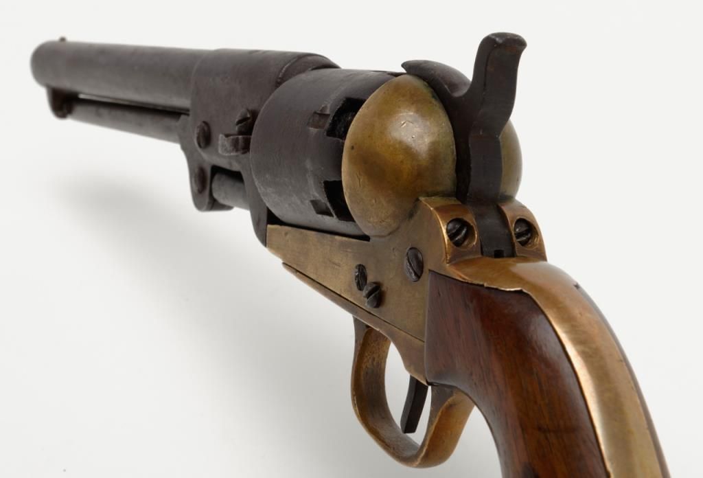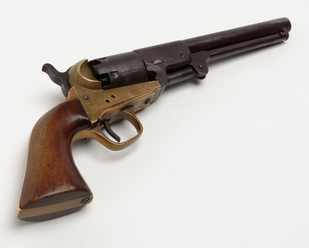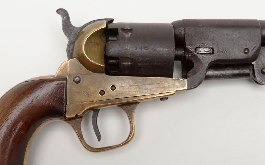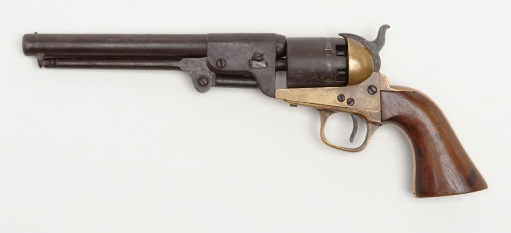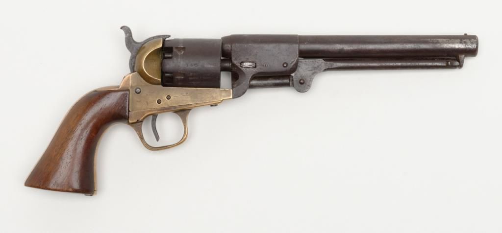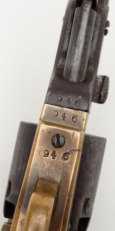 Confederate issue Griswold & Gunnison Navy size percussion revolver in .36 caliber with brass frame, serial number 946. The revolver remains in original good to very good condition showing a brown patina finish with some scattered light tomoderate pitting and erosion. The cylinder and barrel shows some striations and casting flaws in the original manufacturing process. The brass frame shows a mellow and pleasing patina. The edges are fairly sharp. The frame, cylinder,hammer and lever have an identical patina and a great untouched “Out-Of-The-Attic” look. There are some minor marks on the edges of wedge and metal surfaces show just normal use and aging. The grips are well-made old replacements probably duringperiod of use and are not quite shaped properly but have age. A shim of brass is used to tighten the cylinder on the arbor. The frame pins are old replacements made of brass. The main spring is cracked and shows an old leather reinforcement.The gun works and operates but the action is weak. All screws appear original and this is an above average example of the 1st model Griswold and Gunnison. The collection of William A. Gary consigned from his estate. Est.: $14,000-$28,000