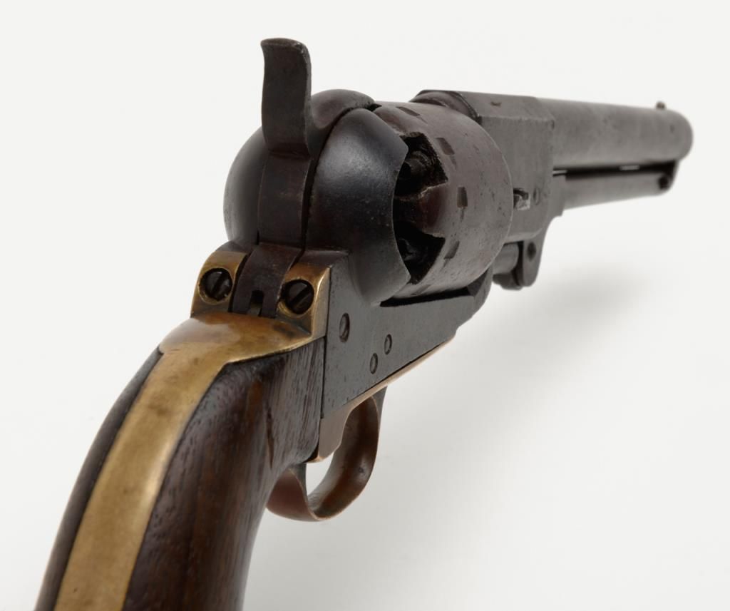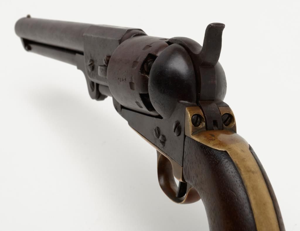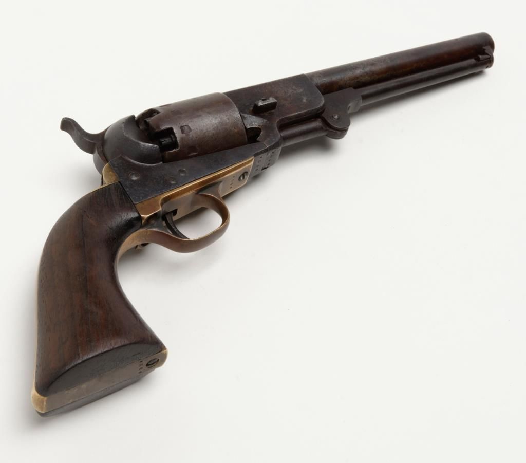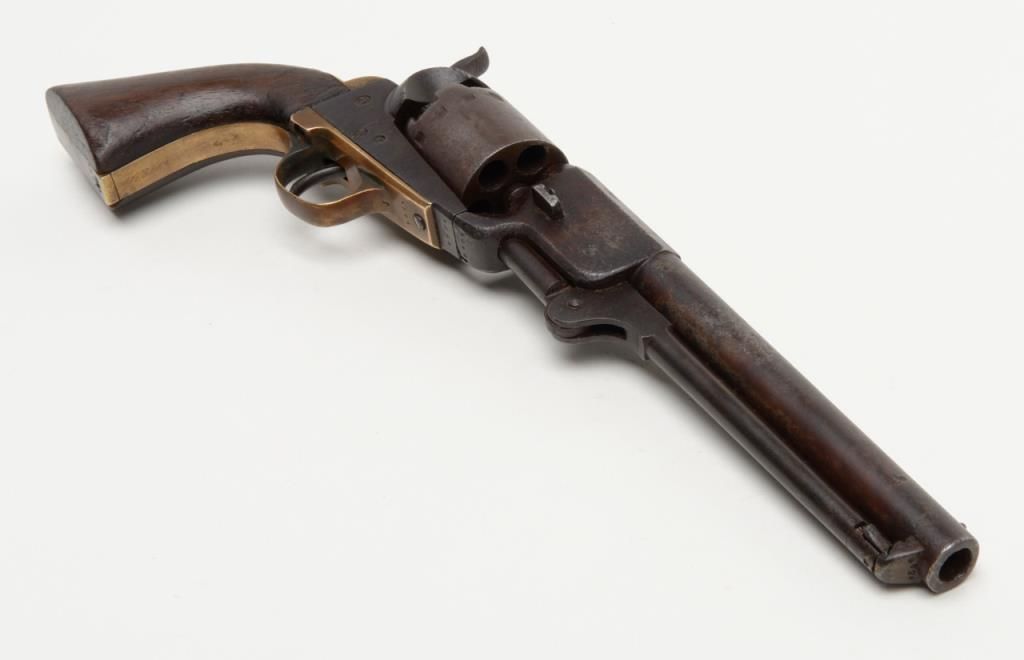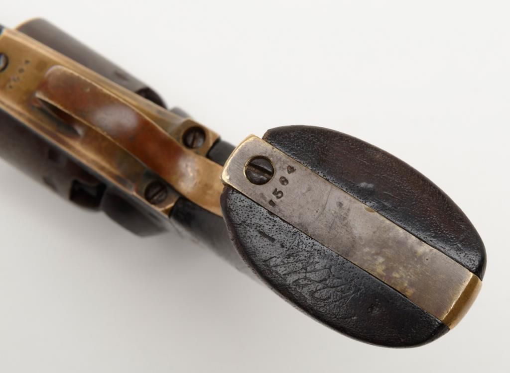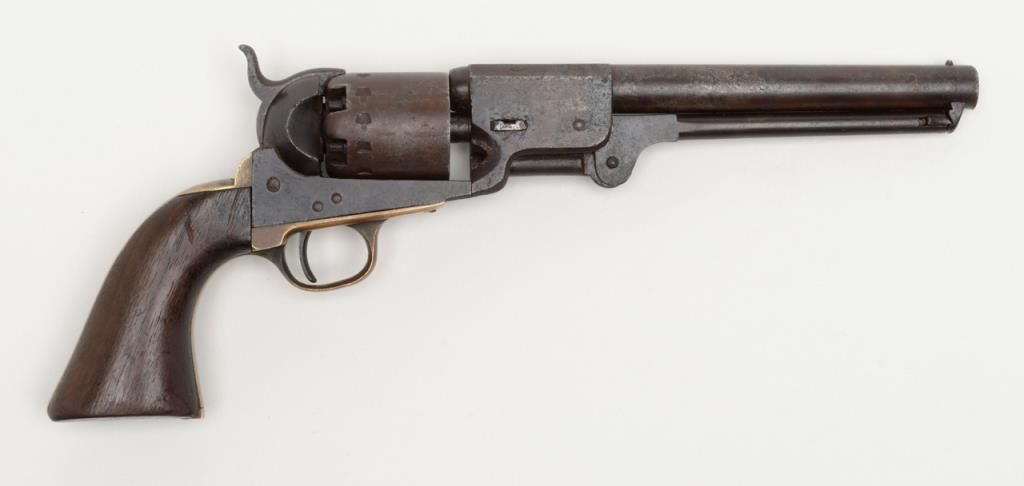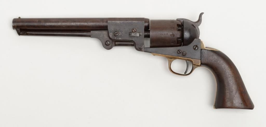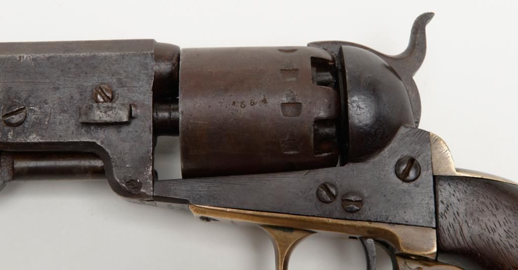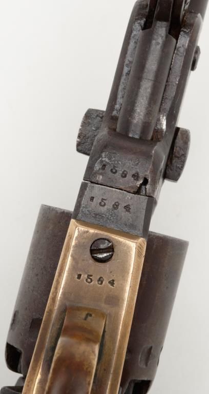 Confederate issue Rigdon & Ansley, .36 caliber percussion Navy size revolver marked “Augusta, GA, CSA” and one of only 18 examples known currently to collectors, serial number 1584. The bottom of the right grip shows the inspectors cartouche ofCapt. Wescom Hudgins the Confederate ordinance inspector. All matching numbers including number in grip channel beneath the grips. This revolver remains in good to very good condition showing a brown patina finish with normal Confederate metalflaws from poor forging process which is what you want to see. A small crack in the barrel lug by the left frame pin and a small loss of metal in that area. The revolver shows its original 12 notch cylinder and the grips are very good plus to near fine for a Confederate revolver with a fully visible cartouche. The action works well and the interior is good. A very sound and attractive Confederate pistol with no problems and no cleaning. This rare pistol has a long provenancehistory beginning with William A. Albaugh from H. O. Kaar of Illinois 1958 sold by W. A. Albaugh to William Florence in 1959 to Clyde Culver, September 1960 to Robert O. Persons to Robert Berryman to Cecil Anderson 1973 to Dr. Tom K.