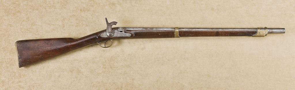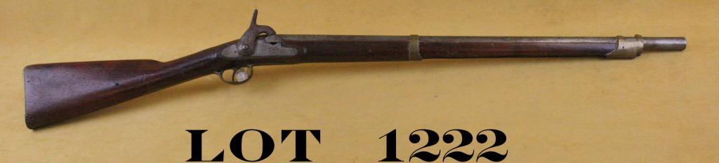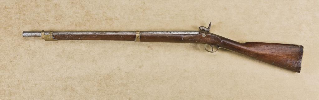 Confederate period copy of a US model 1847 musketoon, .69 caliber, approx. 42” overall with 26-1/4” barrel. The gun shows plain brass mounts, simple construction, with no markings other than “134” stamped over thebuttplate and “49” stamped on rear band. The lock is commandeered from a shotgun lock, the barrel shows a confederate type bolster, and a escutcheon has been inlaid into the wrist which is probably also pressed into servicefrom another arm. The condition is fair with light to moderate scattered erosion and pitting, some slightly heavier pitting on a few areas of the lock, the nipple is missing. The stock only fair and show crudemanufacture and a light coating of shellac or varnish. Murphy and Madaus’ book documents the use of shotgun locks and it is a well-known fact that every gunsmith and blacksmith was refitting usable arms andparts for confederate forces. Est: $3,000 - $6,000