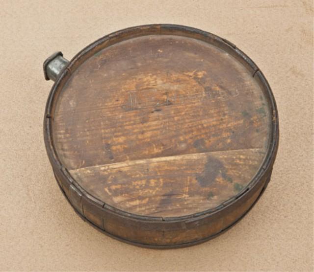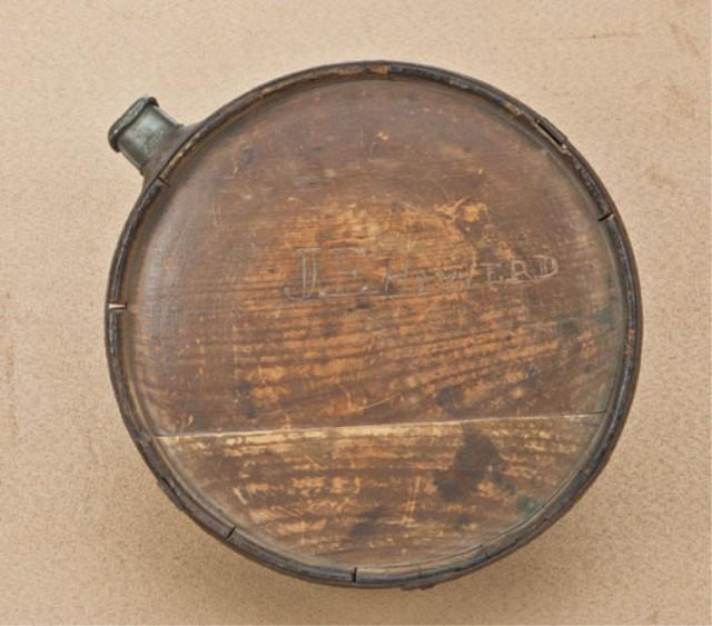 Confederate style wood canteen, possibly cedar with iron straps, tin spout, carved with name “J. E. Howerd”. The canteen measures 7-1/4” across the body, and is approx. 2-3/8” wide. Shows rust on bands and stays, and pewter spout shows iron nails that are also rusty. The body of the canteen shows some opening and warpage from age. Nice patina. If this canteen is not confederate, nothing is. It sings Dixie and smells like southern comfort. Est: $750 - $1,500