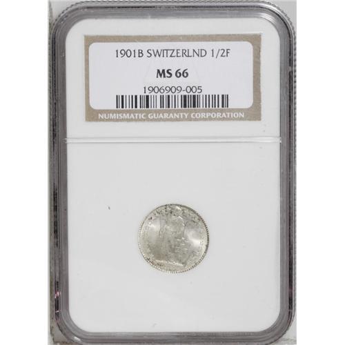 <B>Confederation 1/2 Franc 1901B,</B></I> KM23, MS66 NGC. Sharply struck with full luster and scattered splashes of russet and charcoal toning on the reverse. Rare in this condition.