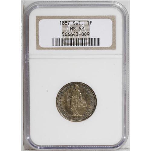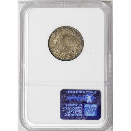 <B>Confederation 1 Franc 1887B,</B></I> KM24. MS62 NGC. Nicely struck with gold and lilac toning and light abrasions.