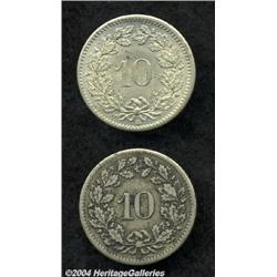 <B>Confederation 10 Rappen Pair,</B></I> KM6 1850 BU with minor spotting and 1851 VF. 2 coins <BR><BR><B>Important notice:</B> Heritage usually auctions material at the rate of 200-250 lots per hour. On some occasions eBay Live bid software or the Internet may not be able to keep up with the pace of the auction. We recommend placing a realistic absentee bid now as insurance to avoid disappointment. Occasionally the auctioneer may eliminate or reject an eBay Live bid, and the auctioneer may also reopen a lot after the close of the eBay live bidding (usually because we missed an audience bid), and may reject your bid even if it shows you as the winning bidder. By bidding via eBay Live, you agree that Heritage may award the lot to another bidder at its sole discretion under the circumstances described above or any other reasonable circumstances. Since eBay bids are not shown to us until we open the lot on the floor, we treat those bids just like floor bids. In most cases the floor responds before the eBay bid is presented to us, due to Internet lag time, so for consistency we have made it a policy that floor bids are always considered first over tie eBay live bids. Also please note that all Heritage lots purchased through eBay Live carry a 20% Buyer's Premium. Please make sure you read the Terms and Conditions before you bid.
