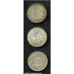 <B>Confederation 10 Rappen Trio,</B></I> KM6 1871 (2), XF and AU-UNC; 1876 XF. 3 coins <BR><BR><B>Important notice:</B> Heritage usually auctions material at the rate of 200-250 lots per hour. On some occasions eBay Live bid software or the Internet may not be able to keep up with the pace of the auction. We recommend placing a realistic absentee bid now as insurance to avoid disappointment. Occasionally the auctioneer may eliminate or reject an eBay Live bid, and the auctioneer may also reopen a lot after the close of the eBay live bidding (usually because we missed an audience bid), and may reject your bid even if it shows you as the winning bidder. By bidding via eBay Live, you agree that Heritage may award the lot to another bidder at its sole discretion under the circumstances described above or any other reasonable circumstances. Since eBay bids are not shown to us until we open the lot on the floor, we treat those bids just like floor bids. In most cases the floor responds before the eBay bid is presented to us, due to Internet lag time, so for consistency we have made it a policy that floor bids are always considered first over tie eBay live bids. Also please note that all Heritage lots purchased through eBay Live carry a 20% Buyer's Premium. Please make sure you read the Terms and Conditions before you bid.