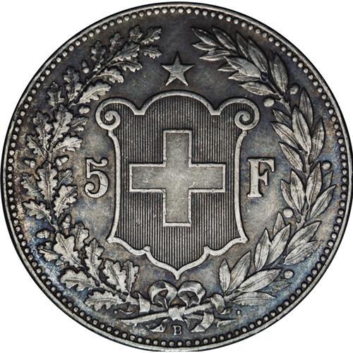 <B>Confederation. 5 Francs 1888-B,</B></I> KM-34, Choice About XF with an appealing look, light gray with bluish hues evenly distributed, almost no marks. Rare, the first date of this type with a mintage of 25,000 pieces.<BR><BR><b>Shipping:</b> Coin/Currency (<a target="_blank" href="http://www.heritageauctions.com/common/shipping.php">view shipping information</a>)