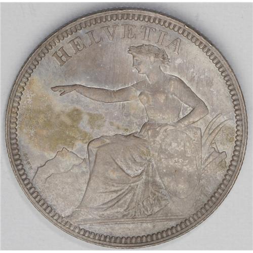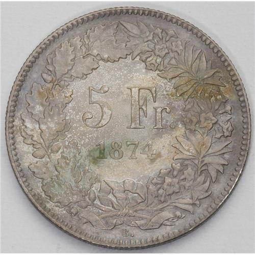 <B>Confederation 5 francs 1874B., </B></I>KM11, dot after date for Brussels Mint, Choice XF, light silver and gray toning. Another attractive piece from this old putaway collection. Untouched surfaces.