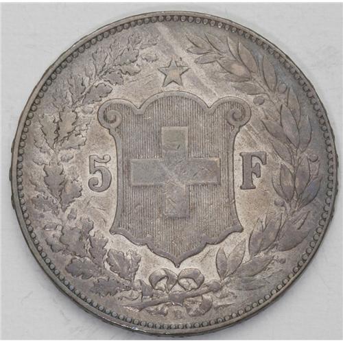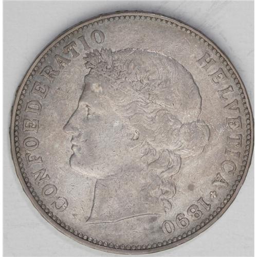 <B>Confederation 5 francs 1890B, </B></I>KM34, VF with the appearance of a nicer coin, tiny abrasions in the ancient light toning. Another piece from the old collection we have mentioned several times.