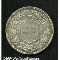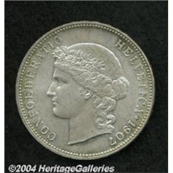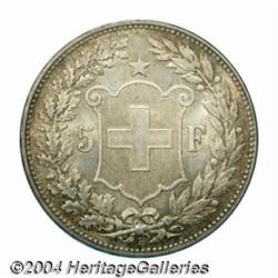 Confederation 5 francs 1907B, Bust left/Shield, KM34, lightly toned, Choice Uncirculated. Important notice: Heritage usually auctions material at the rate of 200-250 lots per hour. On some occasions eBay Live bid software or the Internet may not be able to keep up with the pace of the auction. We recommend placing a realistic absentee bid now as insurance to avoid disappointment. Occasionally the auctioneer may eliminate or reject an eBay Live bid, and the auctioneer may also reopen a lot after the close of the eBay live bidding (usually because we missed an audience bid), and may reject your bid even if it shows you as the winning bidder. By bidding via eBay Live, you agree that Heritage may award the lot to another bidder at its sole discretion under the circumstances described above or any other reasonable circumstances. Also please note that all Heritage lots purchased through eBay Live carry a 20% Buyer's Premium. Please make sure you read the Terms and Conditions before you bid.