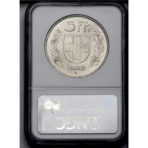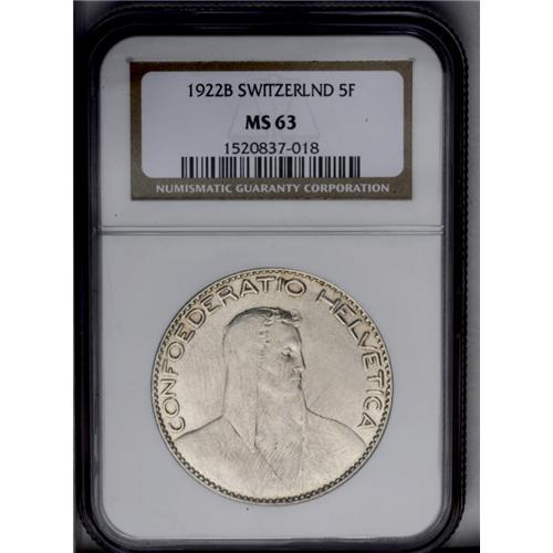 <B>Confederation 5 francs 1922B, </B></I>KM37, MS63 NGC, Choice Brilliant Uncirculated, scattered light abrasions but handsome.