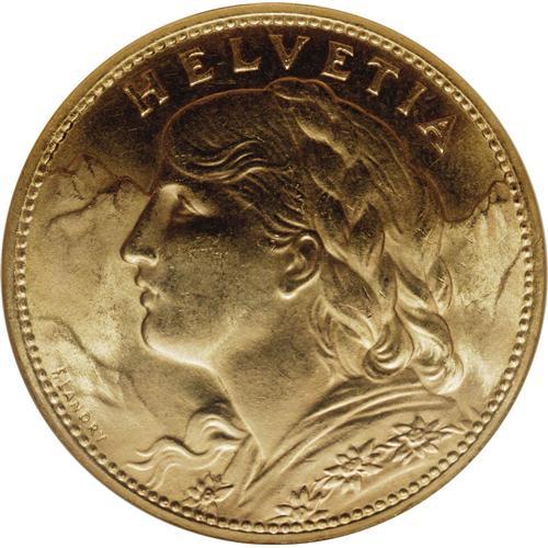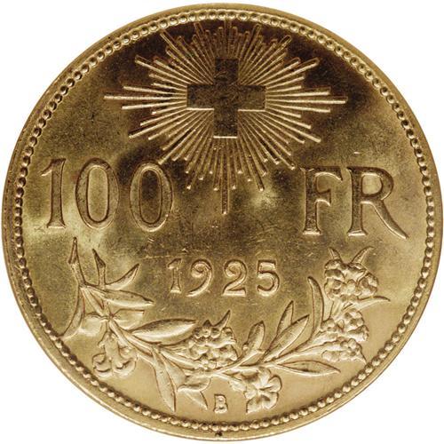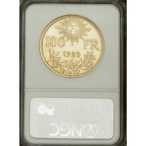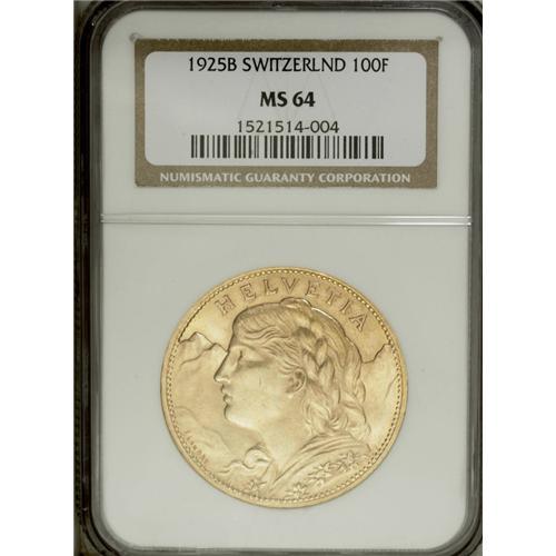<B>Confederation. Gold 100 Francs 1925-B,</B></I> KM-39, MS64 NGC, a few small contact marks away from Gem, very beautiful and gold toned. The mintage of these giants was just 5,000 pieces. Rare.<BR><BR><b>Shipping:</b> Coin/Currency (<a target="_blank" href="http://www.heritageauctions.com/common/shipping.php">view shipping information</a>)
